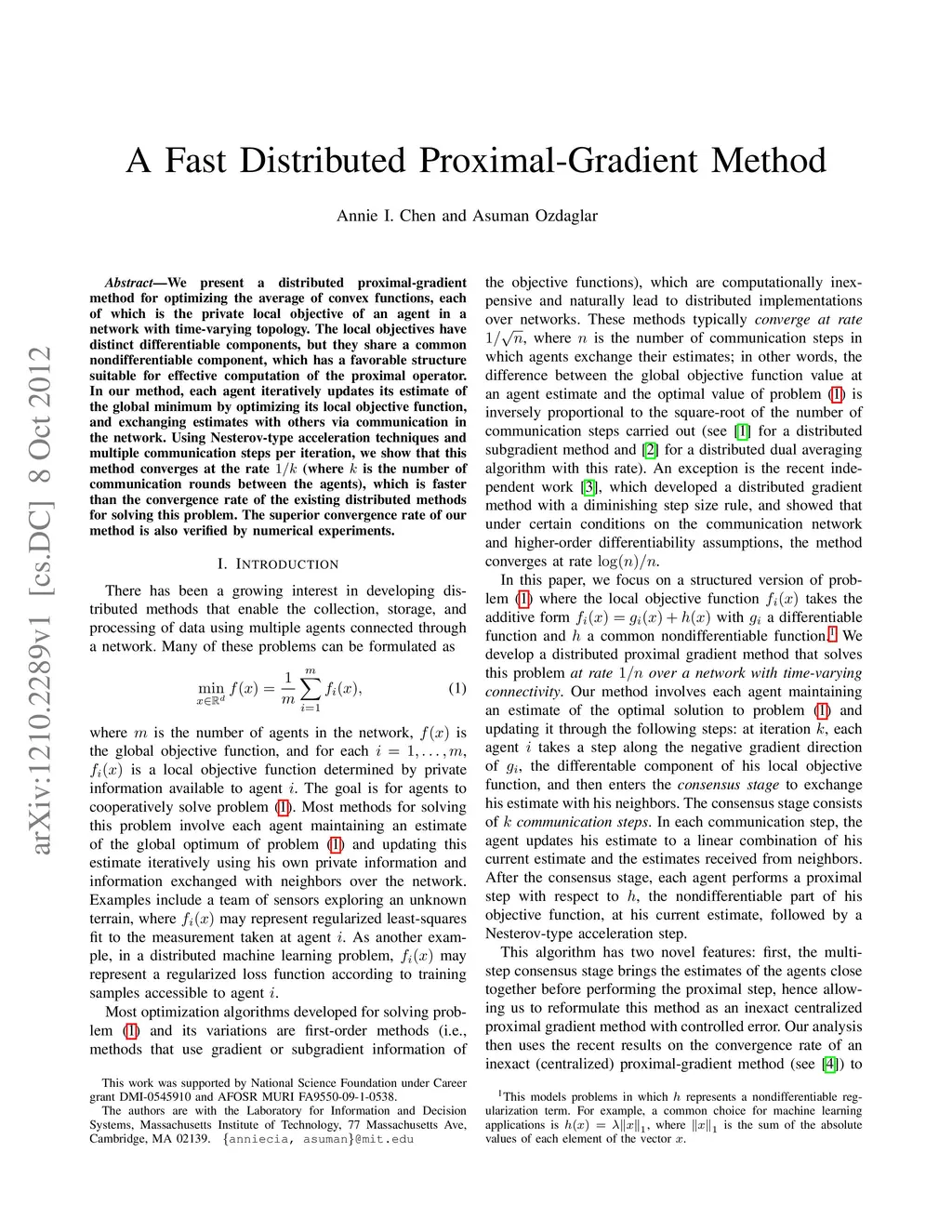 We present a distributed proximal-gradient method for optimizing the average of convex functions, each of which is the private local objective of an agent in a network with time-varying topology. The local objectives have distinct differentiable components, but they share a common nondifferentiable component, which has a favorable structure suitable for effective computation of the proximal operator. In our method, each agent iteratively updates its estimate of the global minimum by optimizing its local objective function, and exchanging estimates with others via communication in the network. Using Nesterov-type acceleration techniques and multiple communication steps per iteration, we show that this method converges at the rate 1/k (where k is the number of communication rounds between the agents), which is faster than the convergence rate of the existing distributed methods for solving this problem. The superior convergence rate of our method is also verified by numerical experiments.