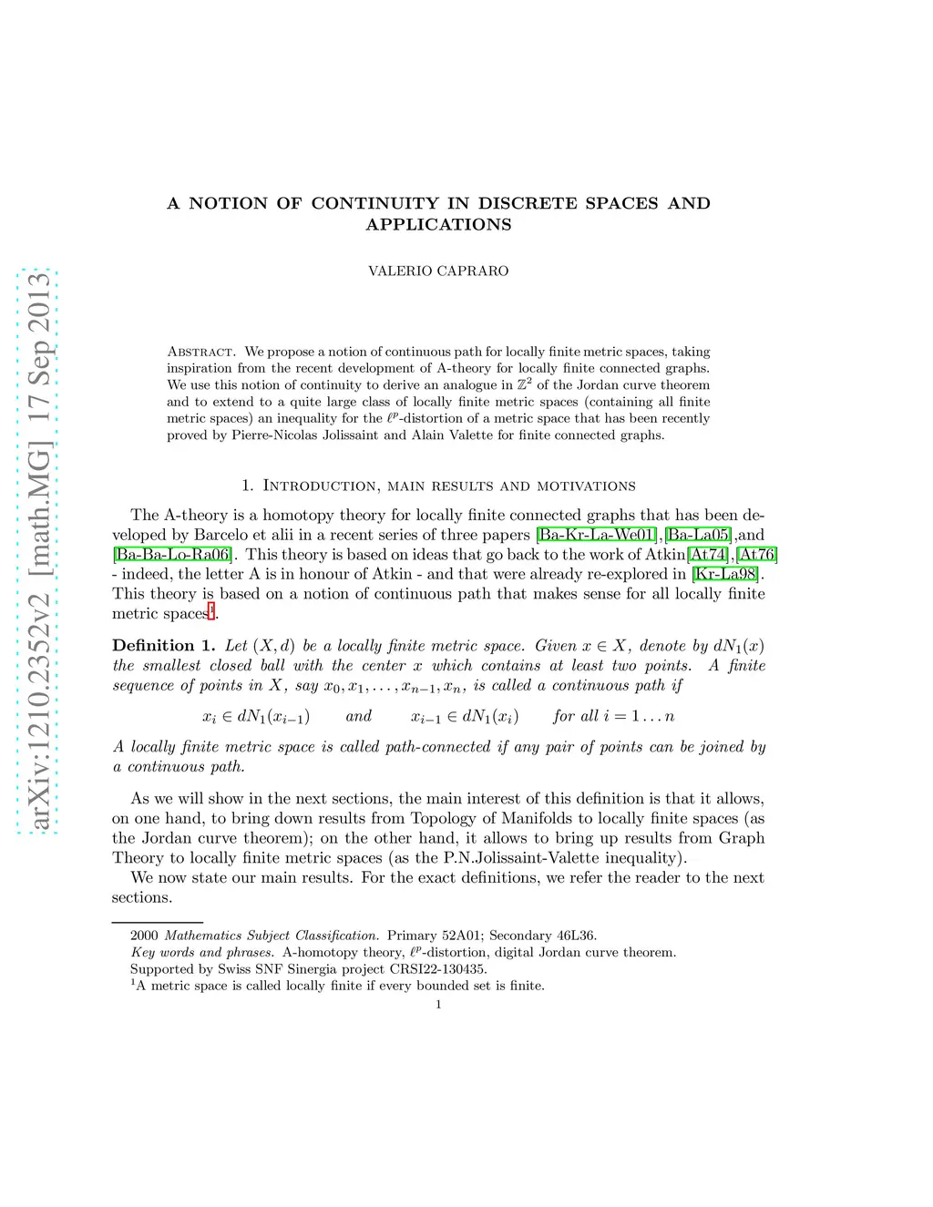 We propose a notion of continuous path for locally finite metric spaces, taking inspiration from the recent development of A-theory for locally finite connected graphs. We use this notion of continuity to derive an analogue in Z^2 of the Jordan curve theorem and to extend to a quite large class of locally finite metric spaces (containing all finite metric spaces) an inequality for the \ell^p-distortion of a metric space that has been recently proved by Pierre-Nicolas Jolissaint and Alain Valette for finite connected graphs.