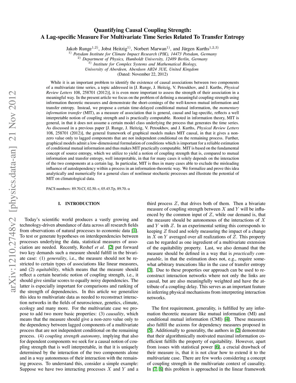 While it is an important problem to identify the existence of causal associations between two components of a multivariate time series, a topic addressed in Runge et al. (2012), it is even more important to assess the strength of their association in a meaningful way. In the present article we focus on the problem of defining a meaningful coupling strength using information theoretic measures and demonstrate the short-comings of the well-known mutual information and transfer entropy. Instead, we propose a certain time-delayed conditional mutual information, the momentary information transfer (MIT), as a measure of association that is general, causal and lag-specific, reflects a well interpretable notion of coupling strength and is practically computable. MIT is based on the fundamental concept of source entropy, which we utilize to yield a notion of coupling strength that is, compared to mutual information and transfer entropy, well interpretable, in that for many cases it solely depends on the interaction of the two components at a certain lag. In particular, MIT is thus in many cases able to exclude the misleading influence of autodependency within a process in an information-theoretic way. We formalize and prove this idea analytically and numerically for a general class of nonlinear stochastic processes and illustrate the potential of MIT on climatological data.