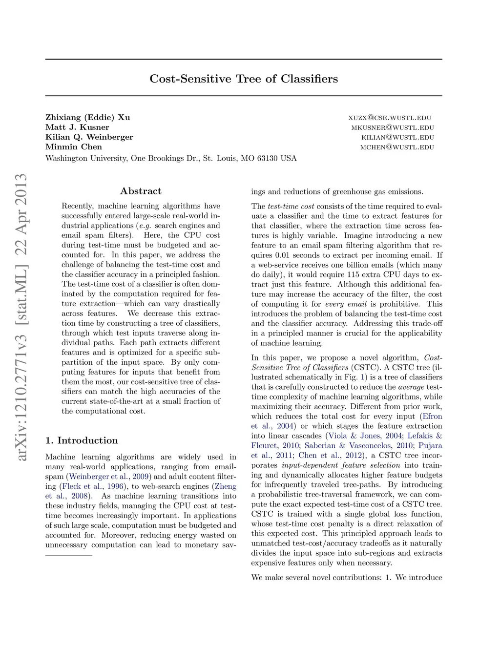 Recently, machine learning algorithms have successfully entered large-scale real-world industrial applications (e.g. search engines and email spam filters). Here, the CPU cost during test time must be budgeted and accounted for. In this paper, we address the challenge of balancing the test-time cost and the classifier accuracy in a principled fashion. The test-time cost of a classifier is often dominated by the computation required for feature extraction-which can vary drastically across eatures. We decrease this extraction time by constructing a tree of classifiers, through which test inputs traverse along individual paths. Each path extracts different features and is optimized for a specific sub-partition of the input space. By only computing features for inputs that benefit from them the most, our cost sensitive tree of classifiers can match the high accuracies of the current state-of-the-art at a small fraction of the computational cost.