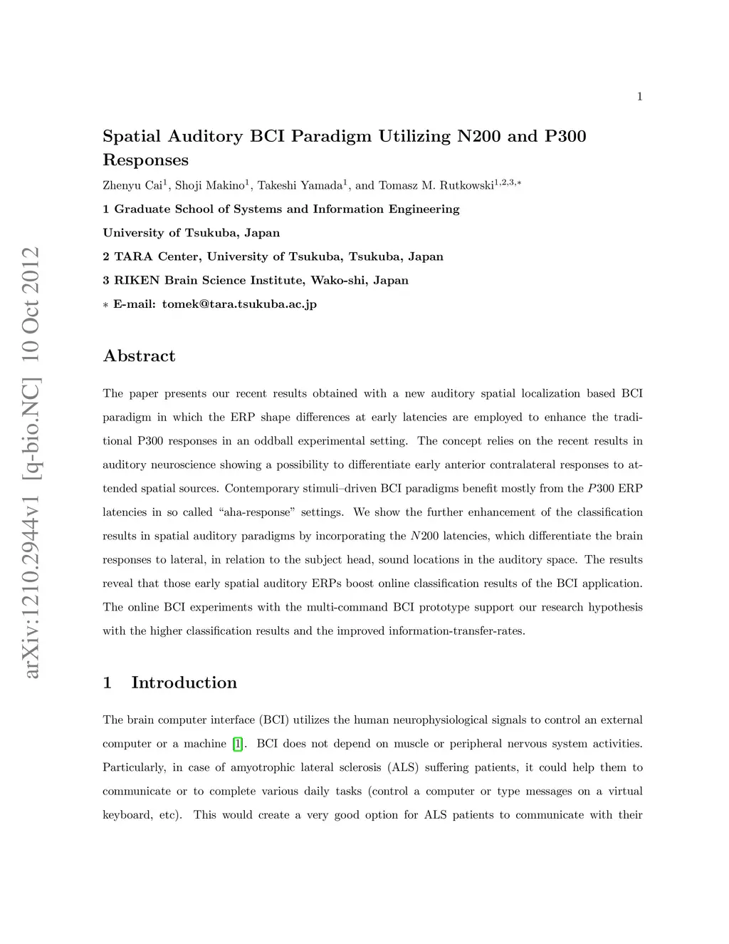 Spatial Auditory BCI Paradigm Utilizing N200 and P300 Responses