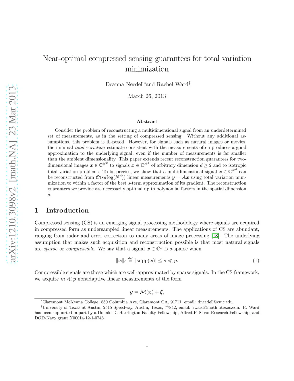 Consider the problem of reconstructing a multidimensional signal from partial information. Without any additional assumptions, this problem is ill-posed. However, for signals such as natural images or movies, the minimal total variation estimate consistent with the measurements often produces a good approximation to the underlying signal, even if the number of measurements is far smaller than the ambient dimensionality. While reconstruction guarantees and optimal measurement designs have been established for related L1-minimization problems, the theory for total variation minimization has remained elusive until recently, when guarantees for two-dimensional images were established. This paper extends the recent theoretical results to signals of arbitrary dimension d>1. To be precise, we show that a multidimensional signal can be reconstructed from O(sd log(N^d)) linear measurements using total variation minimization to within a factor of the best s-term approximation of its gradient. The reconstruction guarantees we provide are necessarily optimal up to polynomial factors in the spatial dimension and a logarithmic factor in the signal dimension N^d. The proof relies on bounds in approximation theory concerning the compressibility of wavelet expansions of bounded-variation functions.