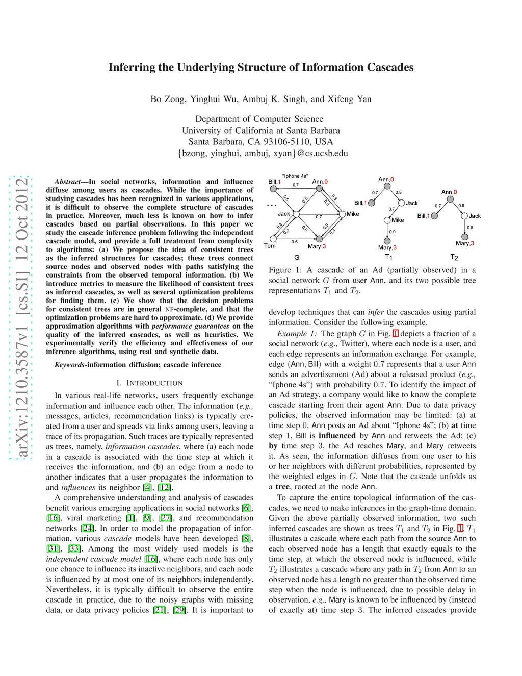 In social networks, information and influence diffuse among users as cascades. While the importance of studying cascades has been recognized in various applications, it is difficult to observe the complete structure of cascades in practice. Moreover, much less is known on how to infer cascades based on partial observations. In this paper we study the cascade inference problem following the independent cascade model, and provide a full treatment from complexity to algorithms: (a) We propose the idea of consistent trees as the inferred structures for cascades; these trees connect source nodes and observed nodes with paths satisfying the constraints from the observed temporal information. (b) We introduce metrics to measure the likelihood of consistent trees as inferred cascades, as well as several optimization problems for finding them. (c) We show that the decision problems for consistent trees are in general NP-complete, and that the optimization problems are hard to approximate. (d) We provide approximation algorithms with performance guarantees on the quality of the inferred cascades, as well as heuristics. We experimentally verify the efficiency and effectiveness of our inference algorithms, using real and synthetic data.