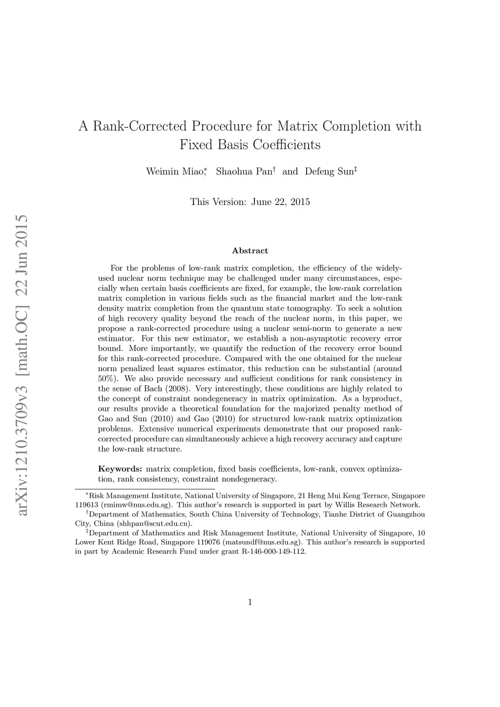 For the problems of low-rank matrix completion, the efficiency of the widely-used nuclear norm technique may be challenged under many circumstances, especially when certain basis coefficients are fixed, for example, the low-rank correlation matrix completion in various fields such as the financial market and the low-rank density matrix completion from the quantum state tomography. To seek a solution of high recovery quality beyond the reach of the nuclear norm, in this paper, we propose a rank-corrected procedure using a nuclear semi-norm to generate a new estimator. For this new estimator, we establish a non-asymptotic recovery error bound. More importantly, we quantify the reduction of the recovery error bound for this rank-corrected procedure. Compared with the one obtained for the nuclear norm penalized least squares estimator, this reduction can be substantial (around 50%). We also provide necessary and sufficient conditions for rank consistency in the sense of Bach (2008). Very interestingly, these conditions are highly related to the concept of constraint nondegeneracy in matrix optimization. As a byproduct, our results provide a theoretical foundation for the majorized penalty method of Gao and Sun (2010) and Gao (2010) for structured low-rank matrix optimization problems. Extensive numerical experiments demonstrate that our proposed rank-corrected procedure can simultaneously achieve a high recovery accuracy and capture the low-rank structure.
