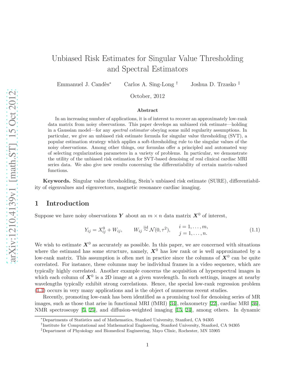 Unbiased Risk Estimates for Singular Value Thresholding and Spectral