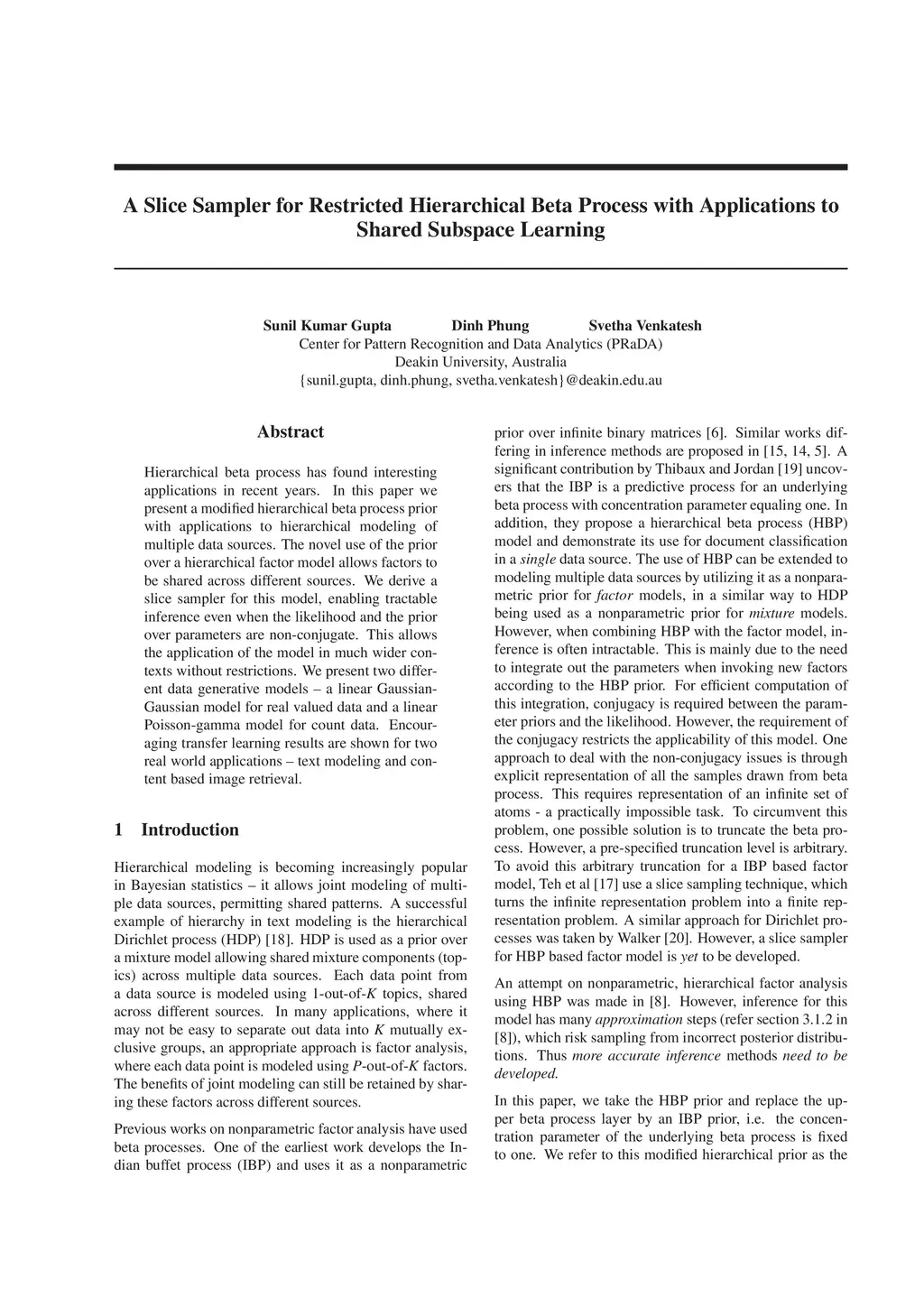 Hierarchical beta process has found interesting applications in recent years. In this paper we present a modified hierarchical beta process prior with applications to hierarchical modeling of multiple data sources. The novel use of the prior over a hierarchical factor model allows factors to be shared across different sources. We derive a slice sampler for this model, enabling tractable inference even when the likelihood and the prior over parameters are non-conjugate. This allows the application of the model in much wider contexts without restrictions. We present two different data generative models a linear GaussianGaussian model for real valued data and a linear Poisson-gamma model for count data. Encouraging transfer learning results are shown for two real world applications text modeling and content based image retrieval.