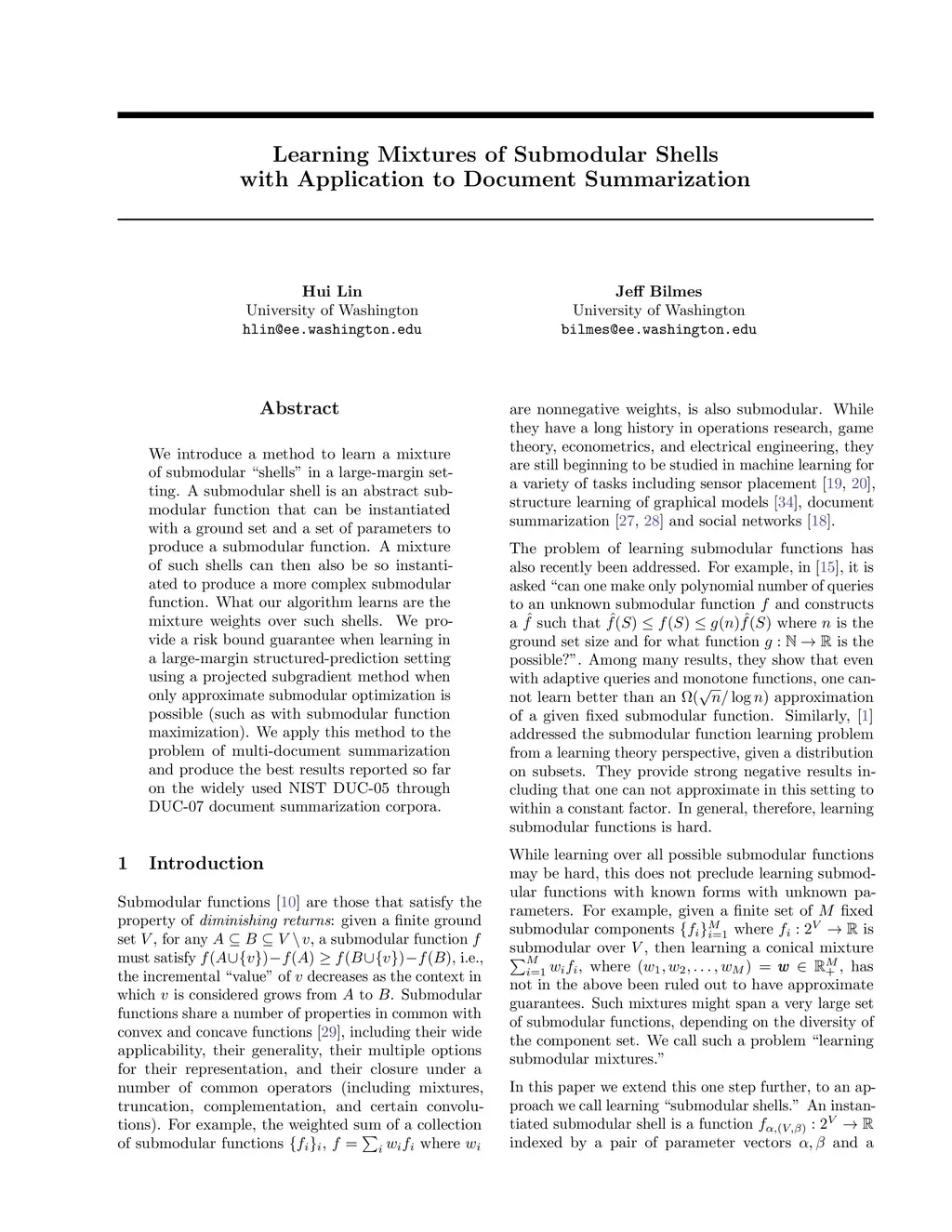 We introduce a method to learn a mixture of submodular "shells" in a large-margin setting. A submodular shell is an abstract submodular function that can be instantiated with a ground set and a set of parameters to produce a submodular function. A mixture of such shells can then also be so instantiated to produce a more complex submodular function. What our algorithm learns are the mixture weights over such shells. We provide a risk bound guarantee when learning in a large-margin structured-prediction setting using a projected subgradient method when only approximate submodular optimization is possible (such as with submodular function maximization). We apply this method to the problem of multi-document summarization and produce the best results reported so far on the widely used NIST DUC-05 through DUC-07 document summarization corpora.