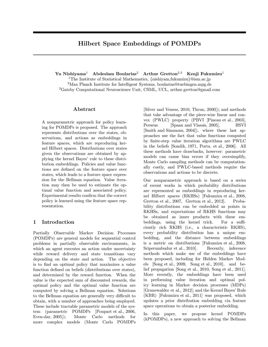 A nonparametric approach for policy learning for POMDPs is proposed. The approach represents distributions over the states, observations, and actions as embeddings in feature spaces, which are reproducing kernel Hilbert spaces. Distributions over states given the observations are obtained by applying the kernel Bayes' rule to these distribution embeddings. Policies and value functions are defined on the feature space over states, which leads to a feature space expression for the Bellman equation. Value iteration may then be used to estimate the optimal value function and associated policy. Experimental results confirm that the correct policy is learned using the feature space representation.