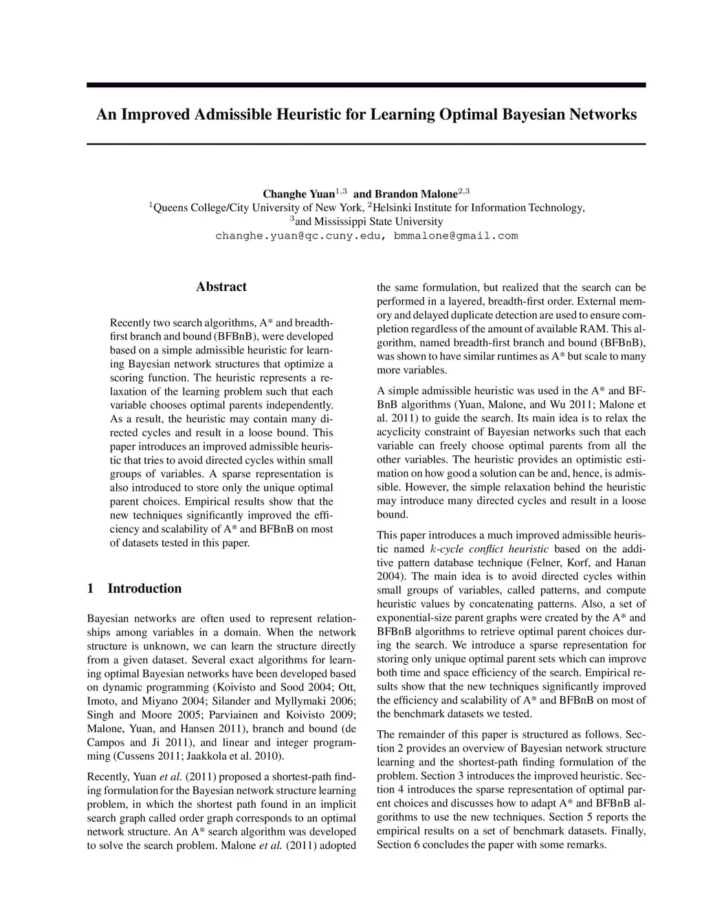 Recently two search algorithms, A* and breadth-first branch and bound (BFBnB), were developed based on a simple admissible heuristic for learning Bayesian network structures that optimize a scoring function. The heuristic represents a relaxation of the learning problem such that each variable chooses optimal parents independently. As a result, the heuristic may contain many directed cycles and result in a loose bound. This paper introduces an improved admissible heuristic that tries to avoid directed cycles within small groups of variables. A sparse representation is also introduced to store only the unique optimal parent choices. Empirical results show that the new techniques significantly improved the efficiency and scalability of A* and BFBnB on most of datasets tested in this paper.