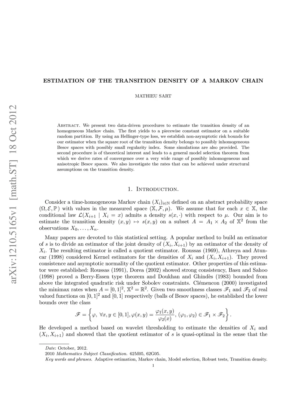 We present two data-driven procedures to estimate the transition density of an homogeneous Markov chain. The first yields to a piecewise constant estimator on a suitable random partition. By using an Hellinger-type loss, we establish non-asymptotic risk bounds for our estimator when the square root of the transition density belongs to possibly inhomogeneous Besov spaces with possibly small regularity index. Some simulations are also provided. The second procedure is of theoretical interest and leads to a general model selection theorem from which we derive rates of convergence over a very wide range of possibly inhomogeneous and anisotropic Besov spaces. We also investigate the rates that can be achieved under structural assumptions on the transition density.