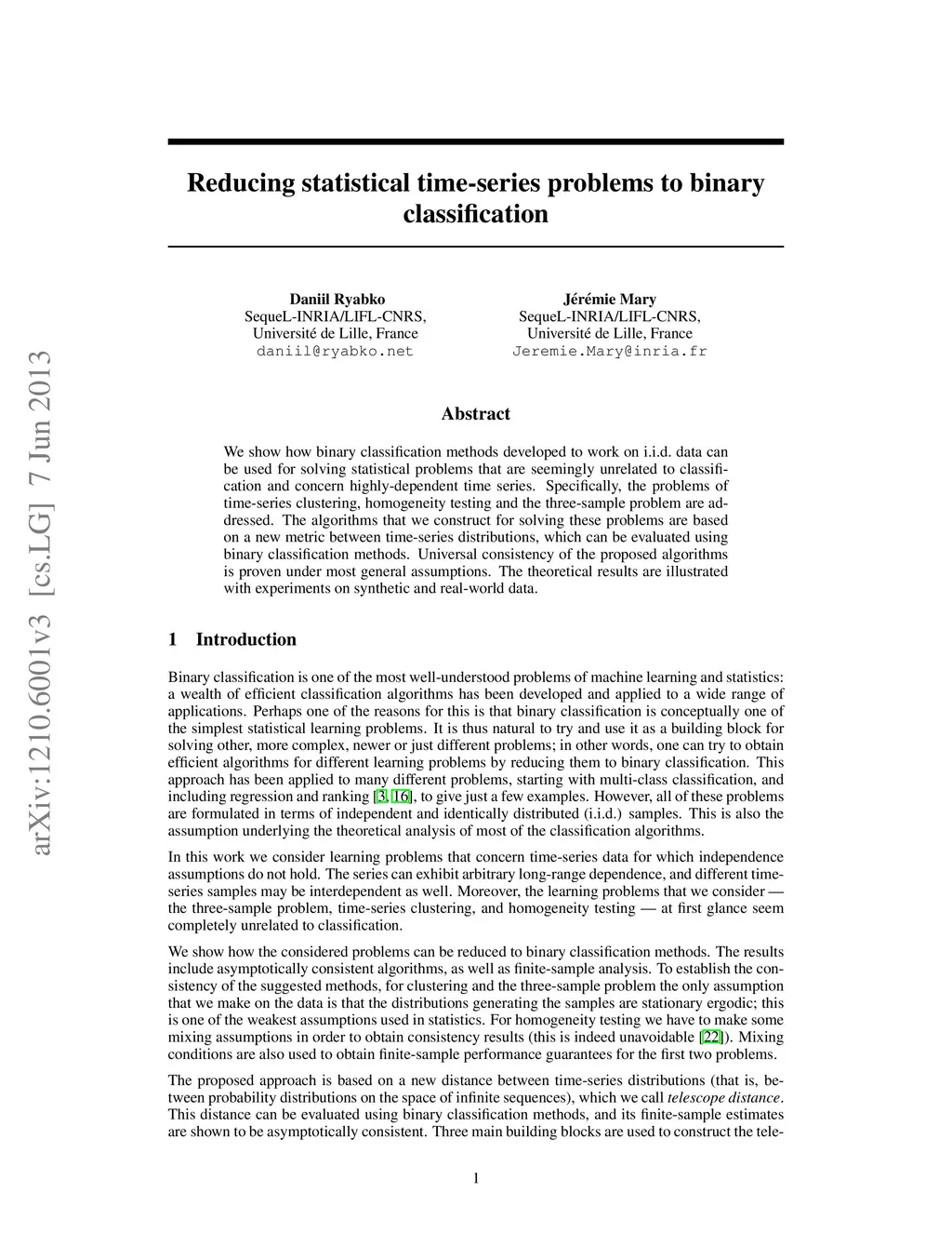 We show how binary classification methods developed to work on i.i.d. data can be used for solving statistical problems that are seemingly unrelated to classification and concern highly-dependent time series. Specifically, the problems of time-series clustering, homogeneity testing and the three-sample problem are addressed. The algorithms that we construct for solving these problems are based on a new metric between time-series distributions, which can be evaluated using binary classification methods. Universal consistency of the proposed algorithms is proven under most general assumptions. The theoretical results are illustrated with experiments on synthetic and real-world data.