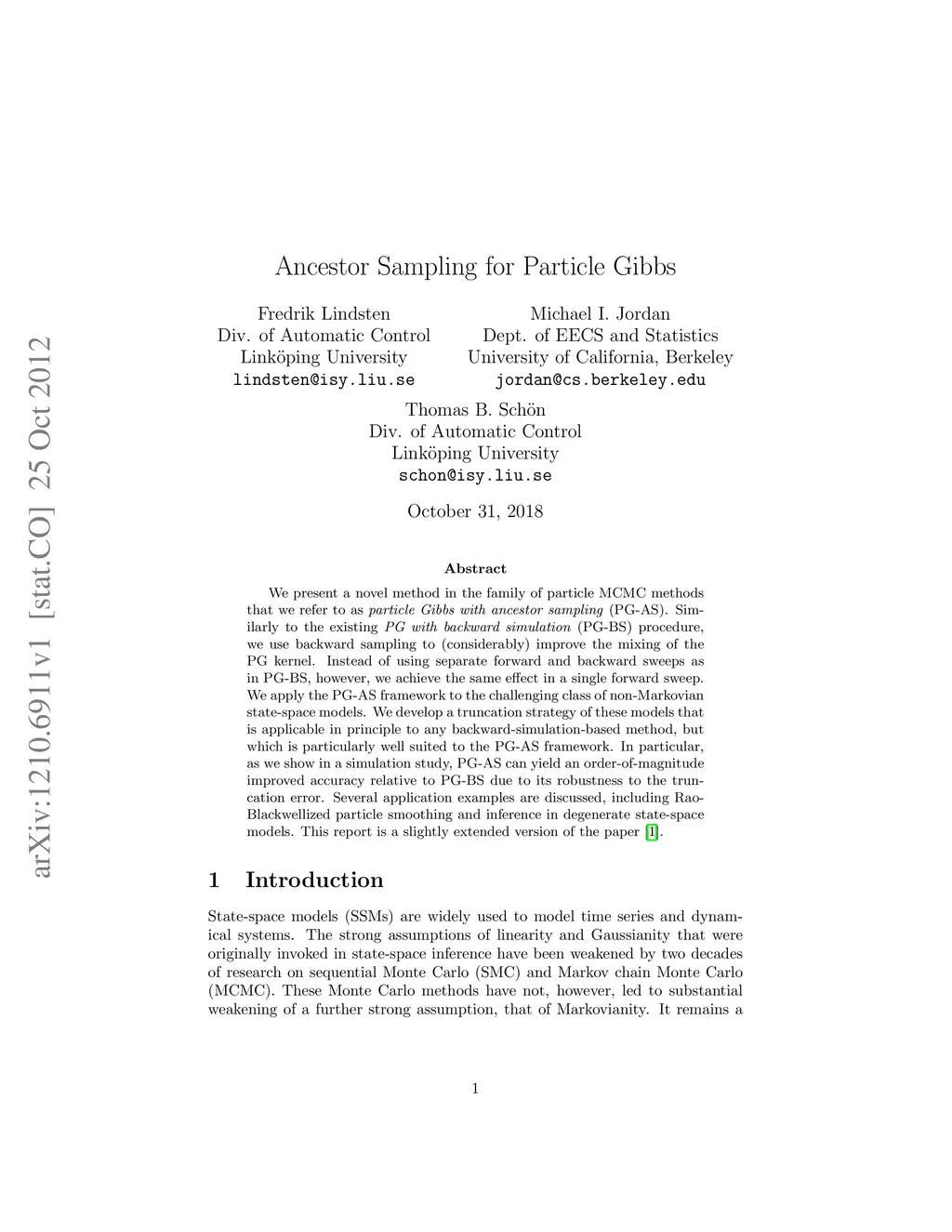 We present a novel method in the family of particle MCMC methods that we refer to as particle Gibbs with ancestor sampling (PG-AS). Similarly to the existing PG with backward simulation (PG-BS) procedure, we use backward sampling to (considerably) improve the mixing of the PG kernel. Instead of using separate forward and backward sweeps as in PG-BS, however, we achieve the same effect in a single forward sweep. We apply the PG-AS framework to the challenging class of non-Markovian state-space models. We develop a truncation strategy of these models that is applicable in principle to any backward-simulation-based method, but which is particularly well suited to the PG-AS framework. In particular, as we show in a simulation study, PG-AS can yield an order-of-magnitude improved accuracy relative to PG-BS due to its robustness to the truncation error. Several application examples are discussed, including Rao-Blackwellized particle smoothing and inference in degenerate state-space models.