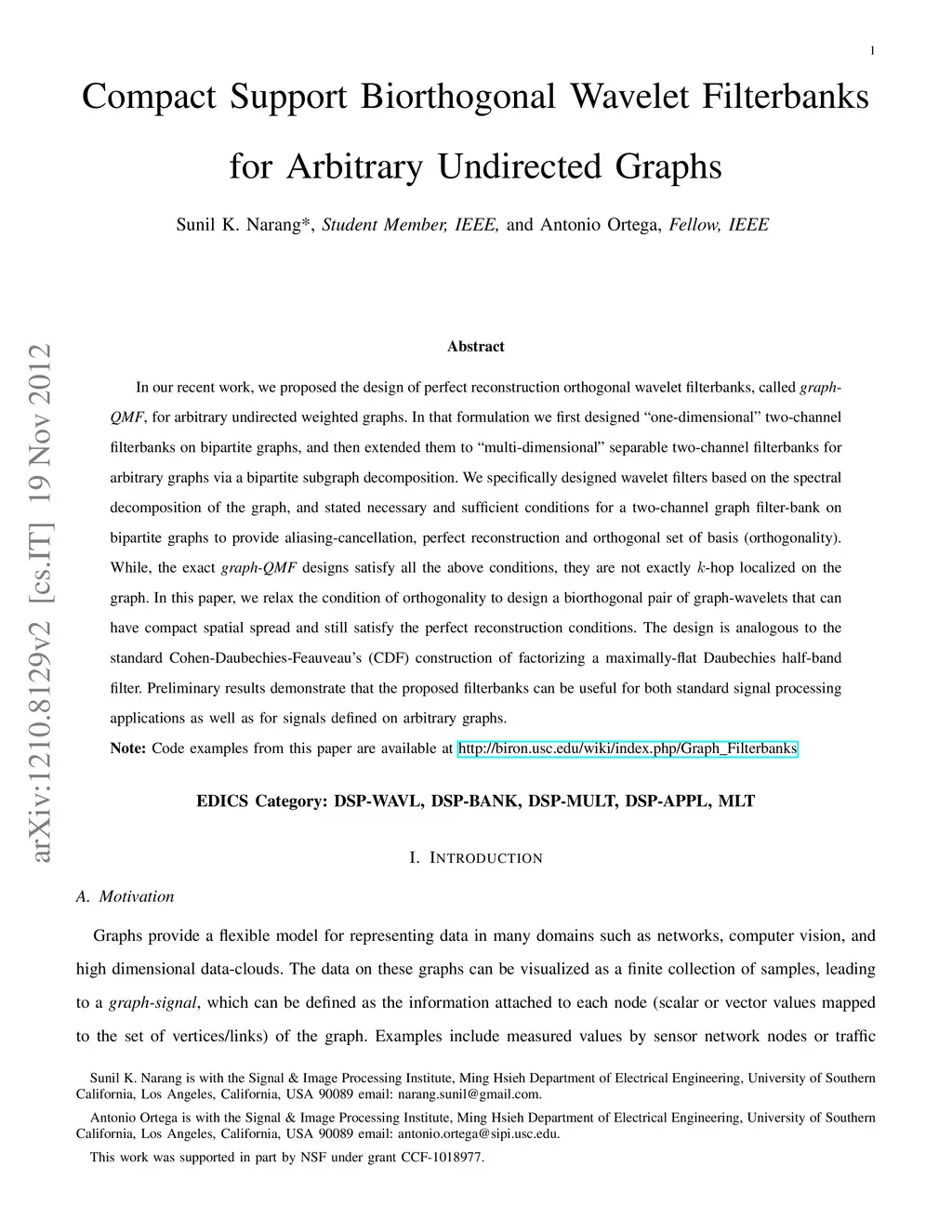 In our recent work, we proposed the design of perfect reconstruction orthogonal wavelet filterbanks, called graph- QMF, for arbitrary undirected weighted graphs. In that formulation we first designed "one-dimensional" two-channel filterbanks on bipartite graphs, and then extended them to "multi-dimensional" separable two-channel filterbanks for arbitrary graphs via a bipartite subgraph decomposition. We specifically designed wavelet filters based on the spectral decomposition of the graph, and stated necessary and sufficient conditions for a two-channel graph filter-bank on bipartite graphs to provide aliasing-cancellation, perfect reconstruction and orthogonal set of basis (orthogonality). While, the exact graph-QMF designs satisfy all the above conditions, they are not exactly k-hop localized on the graph. In this paper, we relax the condition of orthogonality to design a biorthogonal pair of graph-wavelets that can have compact spatial spread and still satisfy the perfect reconstruction conditions. The design is analogous to the standard Cohen-Daubechies-Feauveau's (CDF) construction of factorizing a maximally-flat Daubechies half-band filter. Preliminary results demonstrate that the proposed filterbanks can be useful for both standard signal processing applications as well as for signals defined on arbitrary graphs. Note: Code examples from this paper are available at http://biron.usc.edu/wiki/index.php/Graph Filterbanks