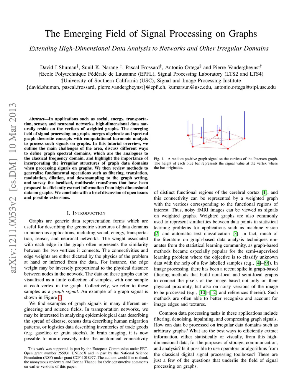 In applications such as social, energy, transportation, sensor, and neuronal networks, high-dimensional data naturally reside on the vertices of weighted graphs. The emerging field of signal processing on graphs merges algebraic and spectral graph theoretic concepts with computational harmonic analysis to process such signals on graphs. In this tutorial overview, we outline the main challenges of the area, discuss different ways to define graph spectral domains, which are the analogues to the classical frequency domain, and highlight the importance of incorporating the irregular structures of graph data domains when processing signals on graphs. We then review methods to generalize fundamental operations such as filtering, translation, modulation, dilation, and downsampling to the graph setting, and survey the localized, multiscale transforms that have been proposed to efficiently extract information from high-dimensional data on graphs. We conclude with a brief discussion of open issues and possible extensions.