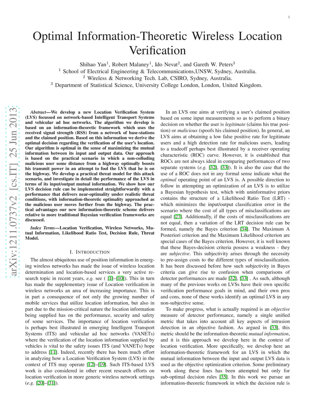 We develop a new Location Verification System (LVS) focussed on network-based Intelligent Transport Systems and vehicular ad hoc networks. The algorithm we develop is based on an information-theoretic framework which uses the received signal strength (RSS) from a network of base-stations and the claimed position. Based on this information we derive the optimal decision regarding the verification of the user's location. Our algorithm is optimal in the sense of maximizing the mutual information between its input and output data. Our approach is based on the practical scenario in which a non-colluding malicious user some distance from a highway optimally boosts his transmit power in an attempt to fool the LVS that he is on the highway. We develop a practical threat model for this attack scenario, and investigate in detail the performance of the LVS in terms of its input/output mutual information. We show how our LVS decision rule can be implemented straightforwardly with a performance that delivers near-optimality under realistic threat conditions, with information-theoretic optimality approached as the malicious user moves further from the highway. The practical advantages our new information-theoretic scheme delivers relative to more traditional Bayesian verification frameworks are discussed.