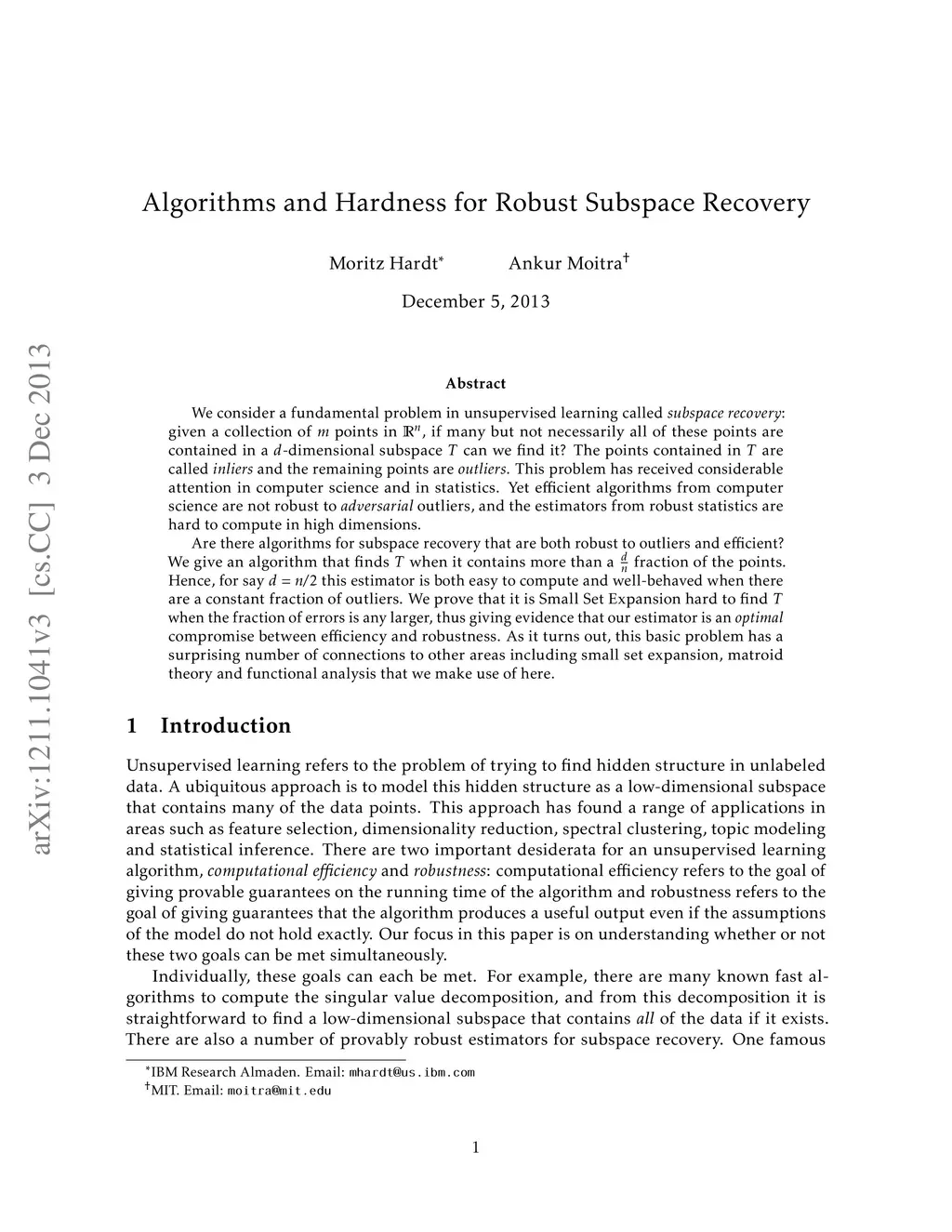 We consider a fundamental problem in unsupervised learning called \emph{subspace recovery}: given a collection of points in , if many but not necessarily all of these points are contained in a -dimensional subspace can we find it? The points contained in are called {\em inliers} and the remaining points are {\em outliers}. This problem has received considerable attention in computer science and in statistics. Yet efficient algorithms from computer science are not robust to {\em adversarial} outliers, and the estimators from robust statistics are hard to compute in high dimensions. Are there algorithms for subspace recovery that are both robust to outliers and efficient? We give an algorithm that finds when it contains more than a fraction of the points. Hence, for say this estimator is both easy to compute and well-behaved when there are a constant fraction of outliers. We prove that it is Small Set Expansion hard to find when the fraction of errors is any larger, thus giving evidence that our estimator is an {\em optimal} compromise between efficiency and robustness. As it turns out, this basic problem has a surprising number of connections to other areas including small set expansion, matroid theory and functional analysis that we make use of here.