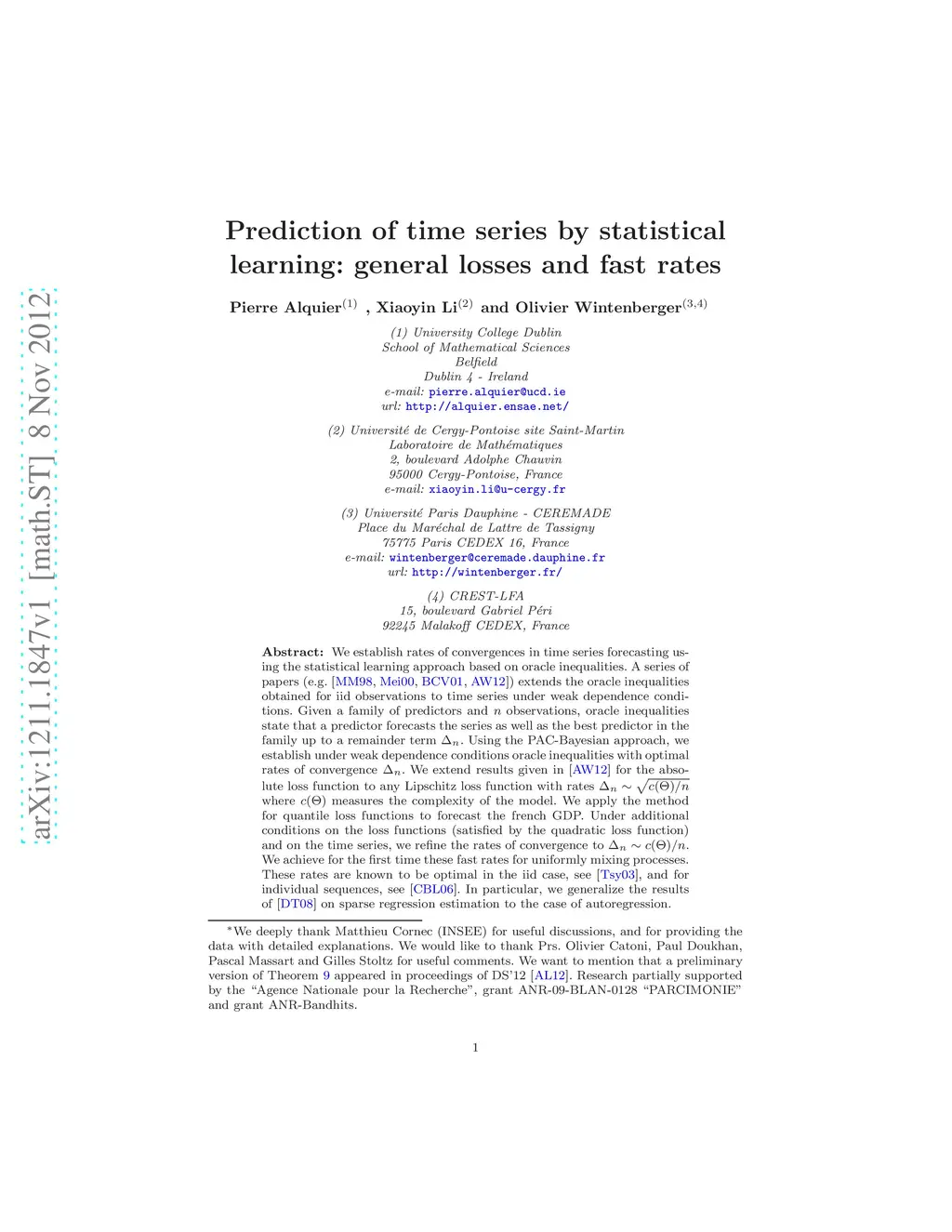We establish rates of convergences in time series forecasting using the statistical learning approach based on oracle inequalities. A series of papers extends the oracle inequalities obtained for iid observations to time series under weak dependence conditions. Given a family of predictors and observations, oracle inequalities state that a predictor forecasts the series as well as the best predictor in the family up to a remainder term . Using the PAC-Bayesian approach, we establish under weak dependence conditions oracle inequalities with optimal rates of convergence. We extend previous results for the absolute loss function to any Lipschitz loss function with rates where measures the complexity of the model. We apply the method for quantile loss functions to forecast the french GDP. Under additional conditions on the loss functions (satisfied by the quadratic loss function) and on the time series, we refine the rates of convergence to . We achieve for the first time these fast rates for uniformly mixing processes. These rates are known to be optimal in the iid case and for individual sequences. In particular, we generalize the results of Dalalyan and Tsybakov on sparse regression estimation to the case of autoregression.