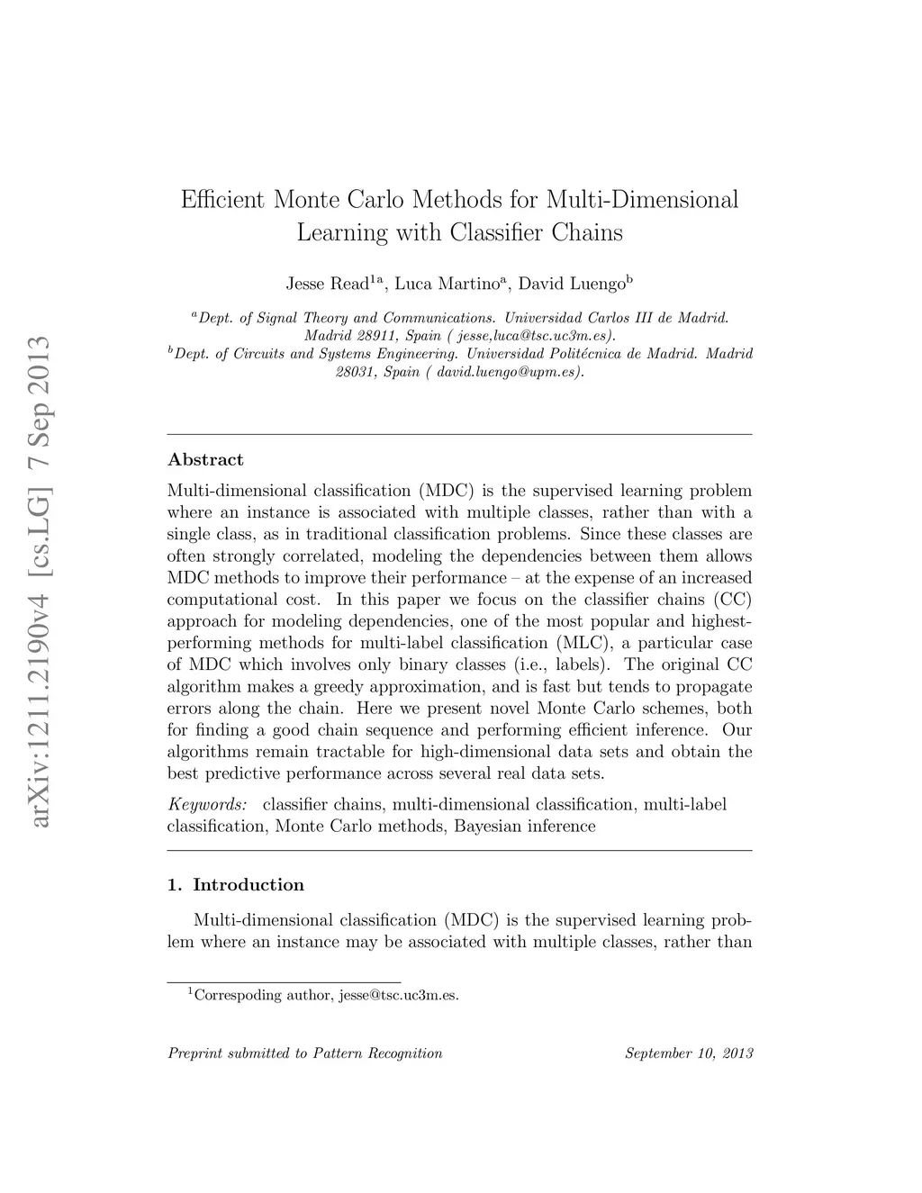 Multi-dimensional classification (MDC) is the supervised learning problem where an instance is associated with multiple classes, rather than with a single class, as in traditional classification problems. Since these classes are often strongly correlated, modeling the dependencies between them allows MDC methods to improve their performance - at the expense of an increased computational cost. In this paper we focus on the classifier chains (CC) approach for modeling dependencies, one of the most popular and highest- performing methods for multi-label classification (MLC), a particular case of MDC which involves only binary classes (i.e., labels). The original CC algorithm makes a greedy approximation, and is fast but tends to propagate errors along the chain. Here we present novel Monte Carlo schemes, both for finding a good chain sequence and performing efficient inference. Our algorithms remain tractable for high-dimensional data sets and obtain the best predictive performance across several real data sets.