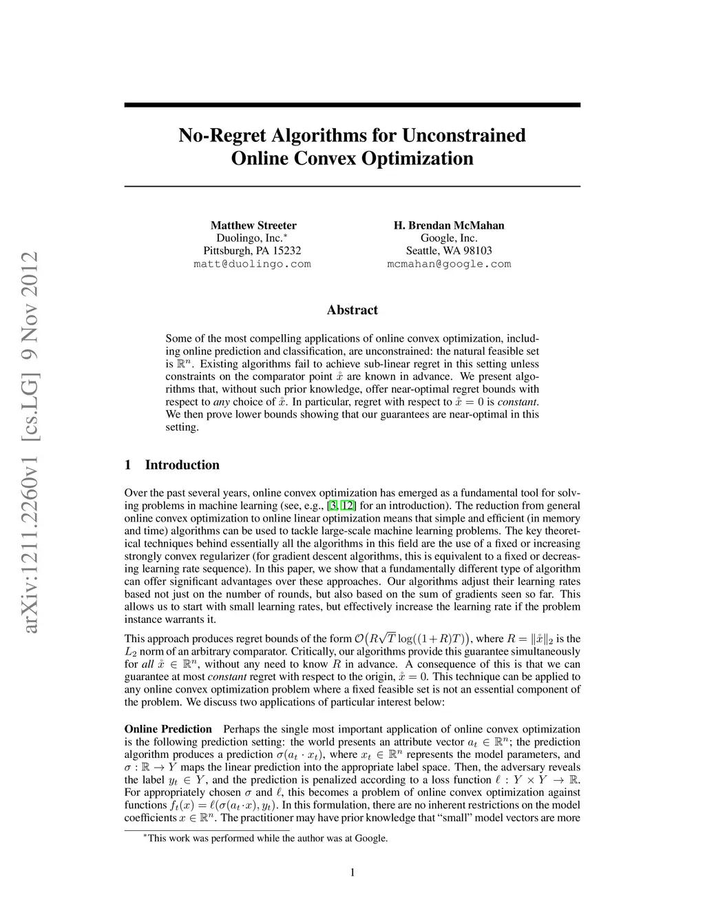 Some of the most compelling applications of online convex optimization, including online prediction and classification, are unconstrained: the natural feasible set is R^n. Existing algorithms fail to achieve sub-linear regret in this setting unless constraints on the comparator point x^* are known in advance. We present algorithms that, without such prior knowledge, offer near-optimal regret bounds with respect to any choice of x^*. In particular, regret with respect to x^* = 0 is constant. We then prove lower bounds showing that our guarantees are near-optimal in this setting.