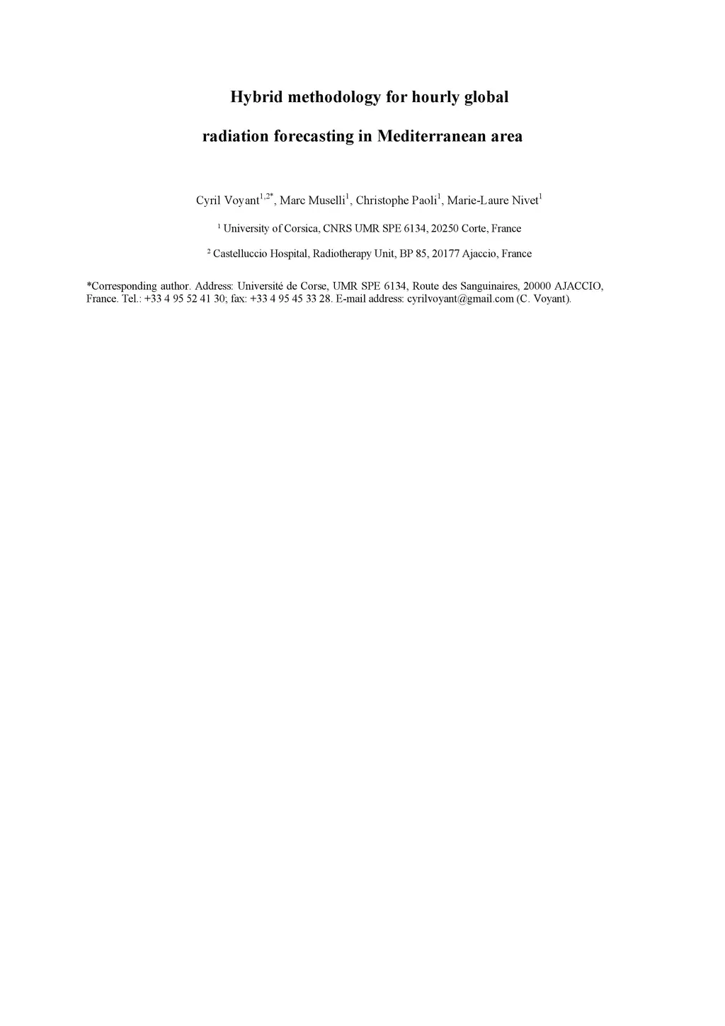 The renewable energies prediction and particularly global radiation forecasting is a challenge studied by a growing number of research teams. This paper proposes an original technique to model the insolation time series based on combining Artificial Neural Network (ANN) and Auto-Regressive and Moving Average (ARMA) model. While ANN by its non-linear nature is effective to predict cloudy days, ARMA techniques are more dedicated to sunny days without cloud occurrences. Thus, three hybrids models are suggested: the first proposes simply to use ARMA for 6 months in spring and summer and to use an optimized ANN for the other part of the year; the second model is equivalent to the first but with a seasonal learning; the last model depends on the error occurred the previous hour. These models were used to forecast the hourly global radiation for five places in Mediterranean area. The forecasting performance was compared among several models: the 3 above mentioned models, the best ANN and ARMA for each location. In the best configuration, the coupling of ANN and ARMA allows an improvement of more than 1%, with a maximum in autumn (3.4%) and a minimum in winter (0.9%) where ANN alone is the best.