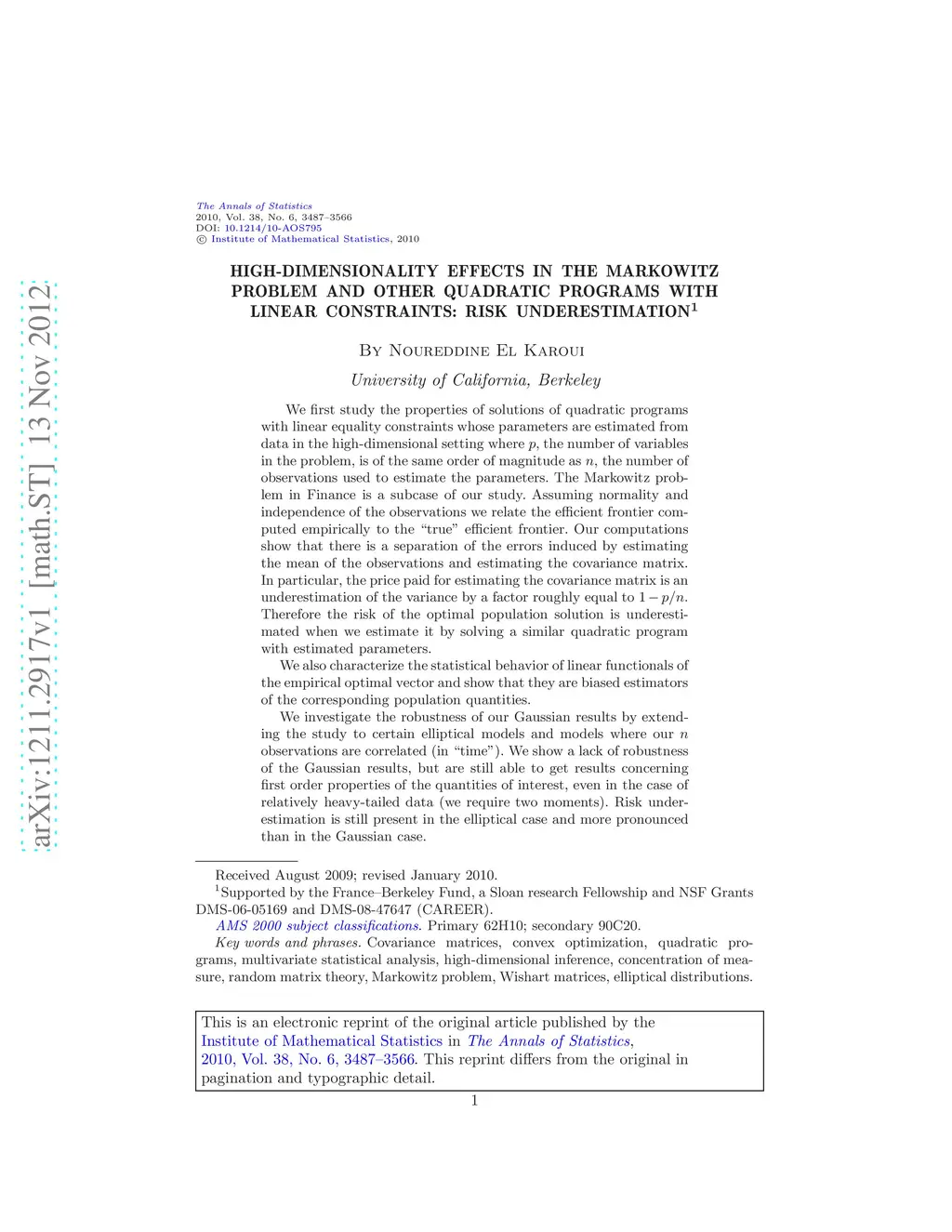We first study the properties of solutions of quadratic programs with linear equality constraints whose parameters are estimated from data in the high-dimensional setting where p, the number of variables in the problem, is of the same order of magnitude as n, the number of observations used to estimate the parameters. The Markowitz problem in Finance is a subcase of our study. Assuming normality and independence of the observations we relate the efficient frontier computed empirically to the "true" efficient frontier. Our computations show that there is a separation of the errors induced by estimating the mean of the observations and estimating the covariance matrix. In particular, the price paid for estimating the covariance matrix is an underestimation of the variance by a factor roughly equal to 1-p/n. Therefore the risk of the optimal population solution is underestimated when we estimate it by solving a similar quadratic program with estimated parameters. We also characterize the statistical behavior of linear functionals of the empirical optimal vector and show that they are biased estimators of the corresponding population quantities.