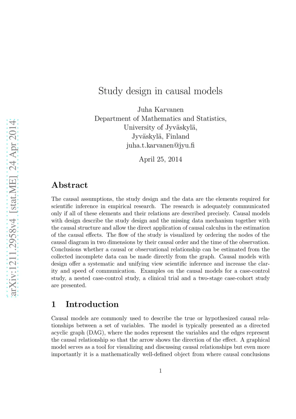 The causal assumptions, the study design and the data are the elements required for scientific inference in empirical research. The research is adequately communicated only if all of these elements and their relations are described precisely. Causal models with design describe the study design and the missing data mechanism together with the causal structure and allow the direct application of causal calculus in the estimation of the causal effects. The flow of the study is visualized by ordering the nodes of the causal diagram in two dimensions by their causal order and the time of the observation. Conclusions whether a causal or observational relationship can be estimated from the collected incomplete data can be made directly from the graph. Causal models with design offer a systematic and unifying view scientific inference and increase the clarity and speed of communication. Examples on the causal models for a case-control study, a nested case-control study, a clinical trial and a two-stage case-cohort study are presented.