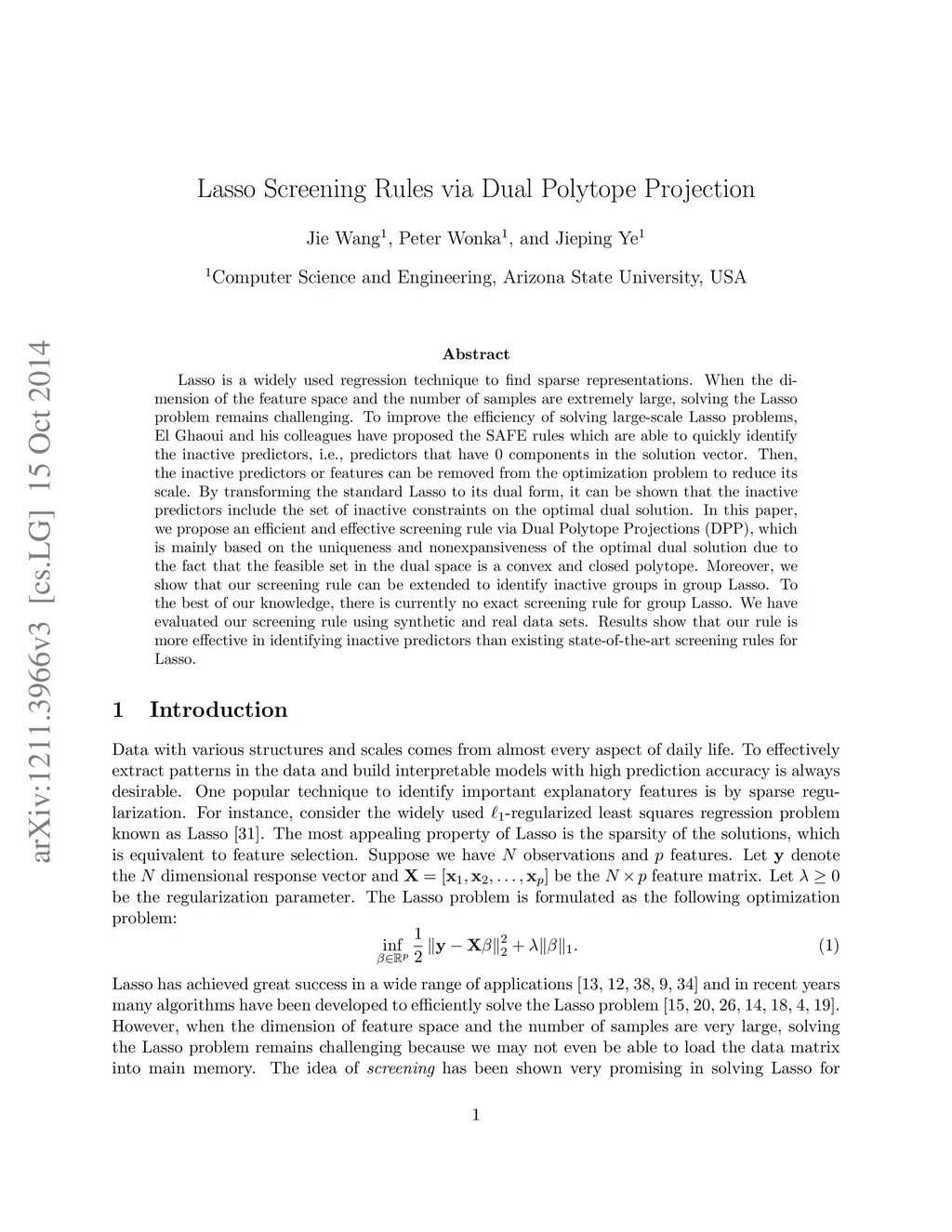 Lasso is a widely used regression technique to find sparse representations. When the dimension of the feature space and the number of samples are extremely large, solving the Lasso problem remains challenging. To improve the efficiency of solving large-scale Lasso problems, El Ghaoui and his colleagues have proposed the SAFE rules which are able to quickly identify the inactive predictors, i.e., predictors that have 0 components in the solution vector. Then, the inactive predictors or features can be removed from the optimization problem to reduce its scale. By transforming the standard Lasso to its dual form, it can be shown that the inactive predictors include the set of inactive constraints on the optimal dual solution. In this paper, we propose a fast and efficient screening rule via Dual Polytope Projections (DPP), which is mainly based on the uniqueness and nonexpansiveness of the optimal dual solution due to the fact that the feasible set in the dual space is a convex and closed polytope. Moreover, we show that our screening rule can be extended to identify inactive groups in group Lasso. To the best of our knowledge, there are currently no "exact" screening rules for group Lasso. We have evaluated our screening rule using both synthetic and real data sets. Results show that our rule is more effective to identify inactive predictors than existing state-of-the-art screening rules.