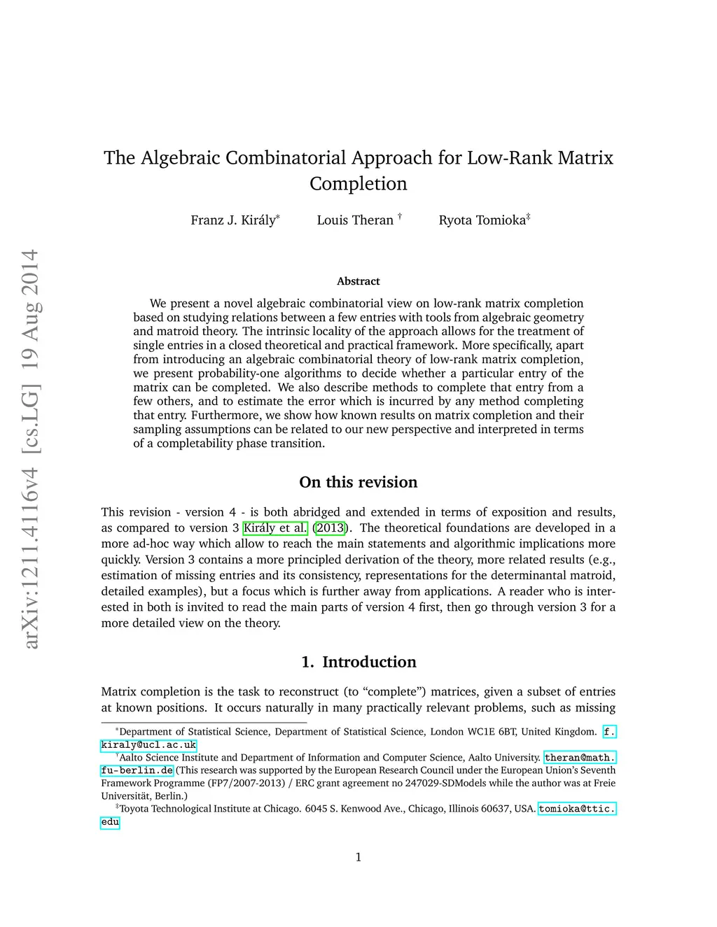 The Algebraic Combinatorial Approach for Low-Rank Matrix Completion