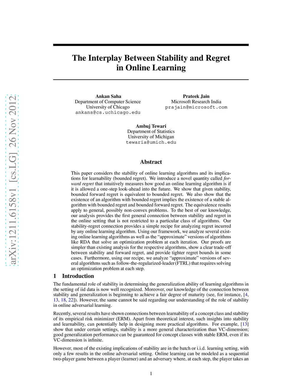 This paper considers the stability of online learning algorithms and its implications for learnability (bounded regret). We introduce a novel quantity called {\em forward regret} that intuitively measures how good an online learning algorithm is if it is allowed a one-step look-ahead into the future. We show that given stability, bounded forward regret is equivalent to bounded regret. We also show that the existence of an algorithm with bounded regret implies the existence of a stable algorithm with bounded regret and bounded forward regret. The equivalence results apply to general, possibly non-convex problems. To the best of our knowledge, our analysis provides the first general connection between stability and regret in the online setting that is not restricted to a particular class of algorithms. Our stability-regret connection provides a simple recipe for analyzing regret incurred by any online learning algorithm. Using our framework, we analyze several existing online learning algorithms as well as the "approximate" versions of algorithms like RDA that solve an optimization problem at each iteration. Our proofs are simpler than existing analysis for the respective algorithms, show a clear trade-off between stability and forward regret, and provide tighter regret bounds in some cases. Furthermore, using our recipe, we analyze "approximate" versions of several algorithms such as follow-the-regularized-leader (FTRL) that requires solving an optimization problem at each step.