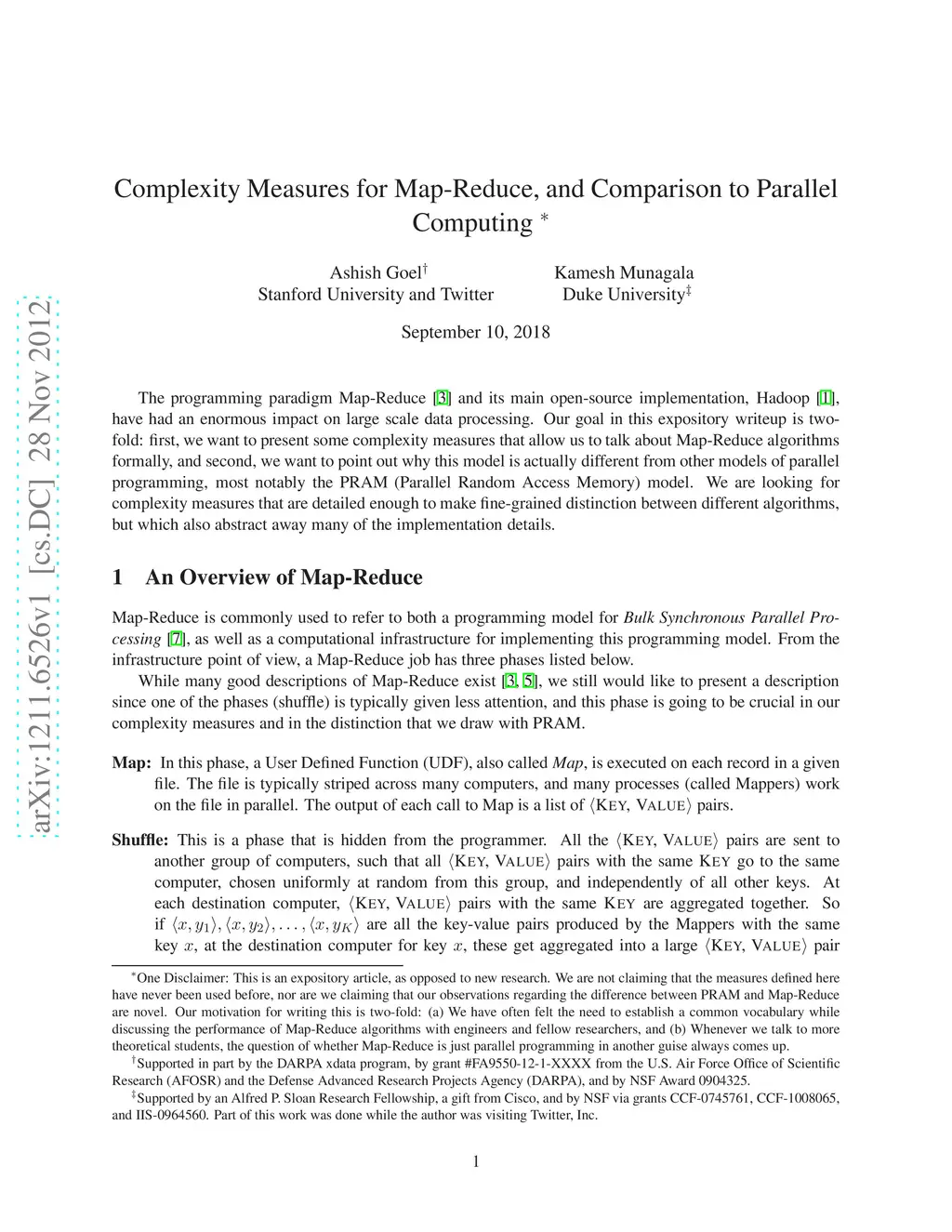 The programming paradigm Map-Reduce and its main open-source implementation, Hadoop, have had an enormous impact on large scale data processing. Our goal in this expository writeup is two-fold: first, we want to present some complexity measures that allow us to talk about Map-Reduce algorithms formally, and second, we want to point out why this model is actually different from other models of parallel programming, most notably the PRAM (Parallel Random Access Memory) model. We are looking for complexity measures that are detailed enough to make fine-grained distinction between different algorithms, but which also abstract away many of the implementation details.