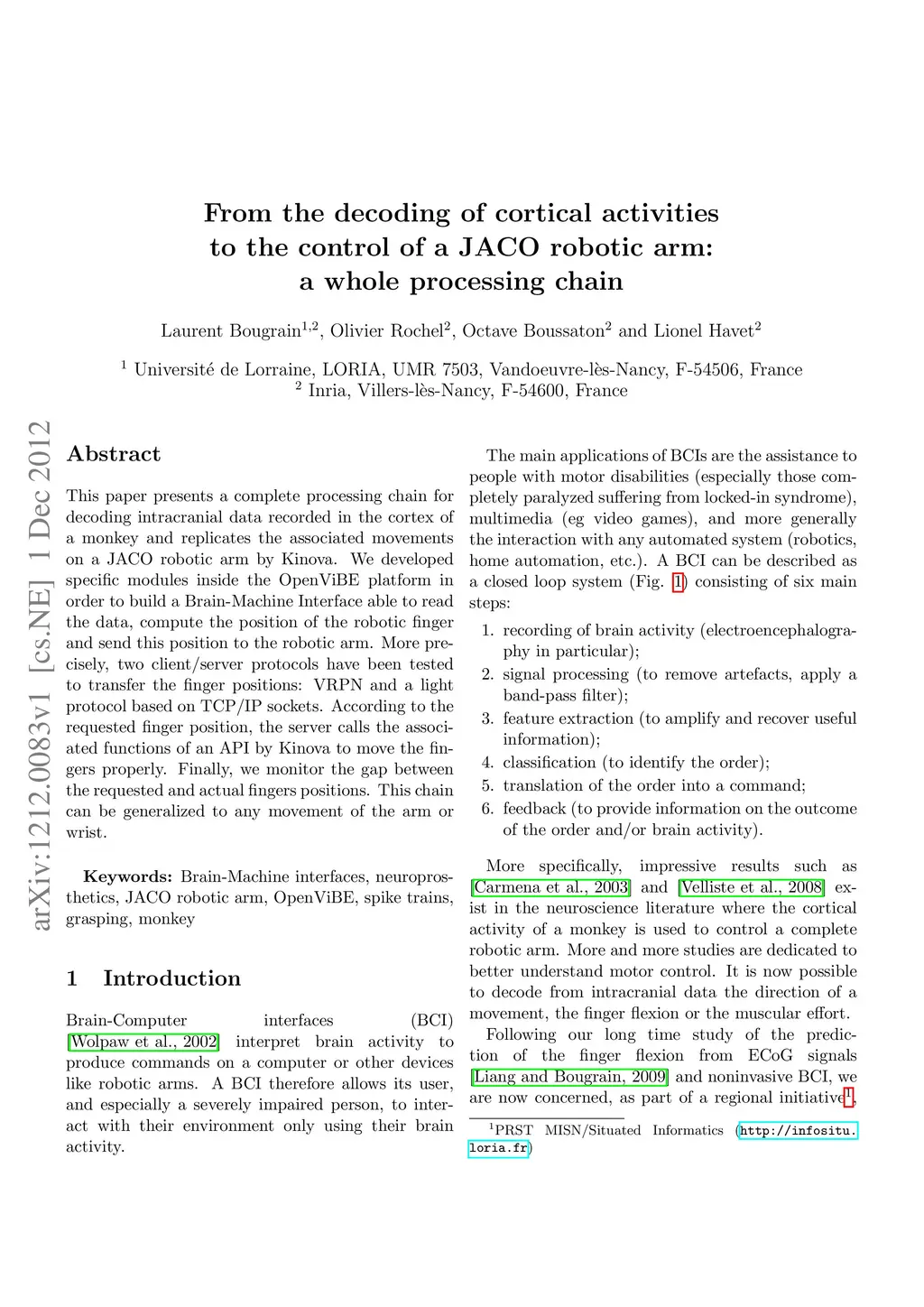 From the decoding of cortical activities to the control of a JACO