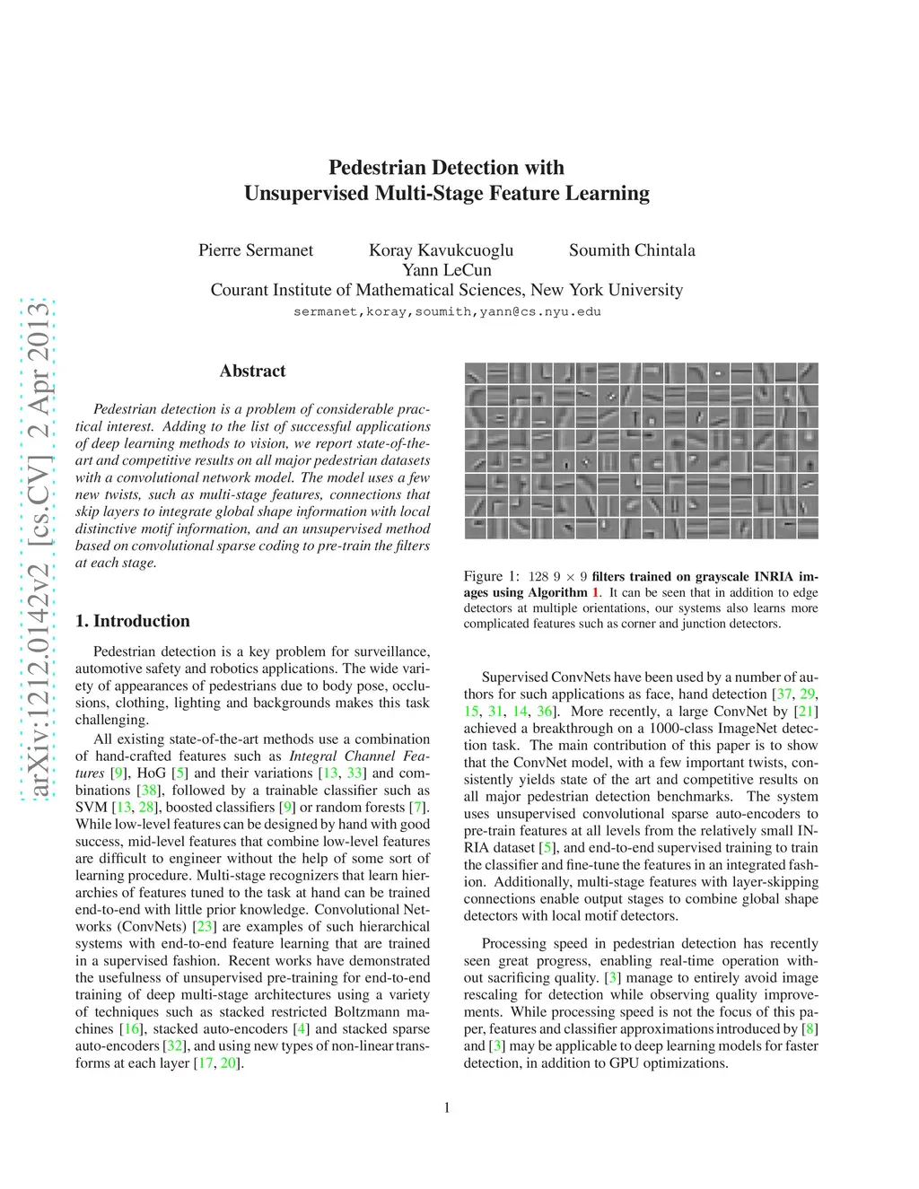 Pedestrian detection is a problem of considerable practical interest. Adding to the list of successful applications of deep learning methods to vision, we report state-of-the-art and competitive results on all major pedestrian datasets with a convolutional network model. The model uses a few new twists, such as multi-stage features, connections that skip layers to integrate global shape information with local distinctive motif information, and an unsupervised method based on convolutional sparse coding to pre-train the filters at each stage.