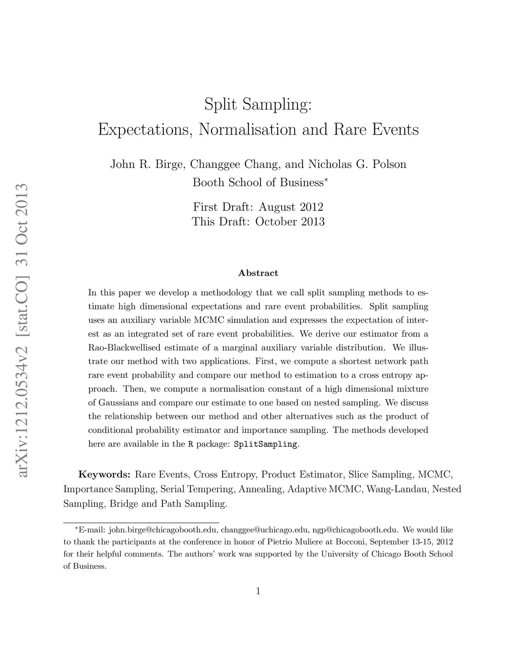 In this paper we develop a methodology that we call split sampling methods to estimate high dimensional expectations and rare event probabilities. Split sampling uses an auxiliary variable MCMC simulation and expresses the expectation of interest as an integrated set of rare event probabilities. We derive our estimator from a Rao-Blackwellised estimate of a marginal auxiliary variable distribution. We illustrate our method with two applications. First, we compute a shortest network path rare event probability and compare our method to estimation to a cross entropy approach. Then, we compute a normalisation constant of a high dimensional mixture of Gaussians and compare our estimate to one based on nested sampling. We discuss the relationship between our method and other alternatives such as the product of conditional probability estimator and importance sampling. The methods developed here are available in the R package: SplitSampling.