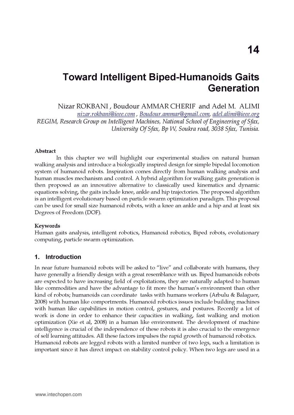 In this chapter we will highlight our experimental studies on natural human walking analysis and introduce a biologically inspired design for simple bipedal locomotion system of humanoid robots. Inspiration comes directly from human walking analysis and human muscles mechanism and control. A hybrid algorithm for walking gaits generation is then proposed as an innovative alternative to classically used kinematics and dynamic equations solving, the gaits include knee, ankle and hip trajectories. The proposed algorithm is an intelligent evolutionary based on particle swarm optimization paradigm. This proposal can be used for small size humanoid robots, with a knee an ankle and a hip and at least six Degrees of Freedom (DOF).