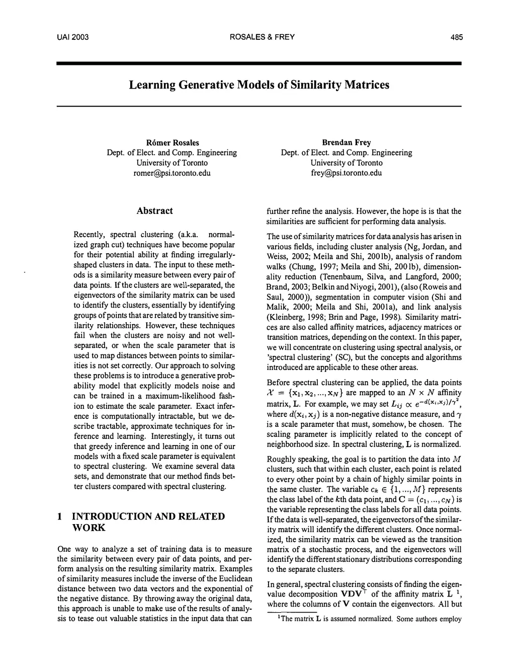 We describe a probabilistic (generative) view of affinity matrices along with inference algorithms for a subclass of problems associated with data clustering. This probabilistic view is helpful in understanding different models and algorithms that are based on affinity functions OF the data. IN particular, we show how(greedy) inference FOR a specific probabilistic model IS equivalent TO the spectral clustering algorithm.It also provides a framework FOR developing new algorithms AND extended models. AS one CASE, we present new generative data clustering models that allow us TO infer the underlying distance measure suitable for the clustering problem at hand. These models seem to perform well in a larger class of problems for which other clustering algorithms (including spectral clustering) usually fail. Experimental evaluation was performed in a variety point data sets, showing excellent performance.