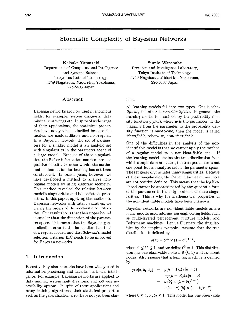 Bayesian networks are now being used in enormous fields, for example, diagnosis of a system, data mining, clustering and so on. In spite of their wide range of applications, the statistical properties have not yet been clarified, because the models are nonidentifiable and non-regular. In a Bayesian network, the set of its parameter for a smaller model is an analytic set with singularities in the space of large ones. Because of these singularities, the Fisher information matrices are not positive definite. In other words, the mathematical foundation for learning was not constructed. In recent years, however, we have developed a method to analyze non-regular models using algebraic geometry. This method revealed the relation between the models singularities and its statistical properties. In this paper, applying this method to Bayesian networks with latent variables, we clarify the order of the stochastic complexities.Our result claims that the upper bound of those is smaller than the dimension of the parameter space. This means that the Bayesian generalization error is also far smaller than that of regular model, and that Schwarzs model selection criterion BIC needs to be improved for Bayesian networks.
