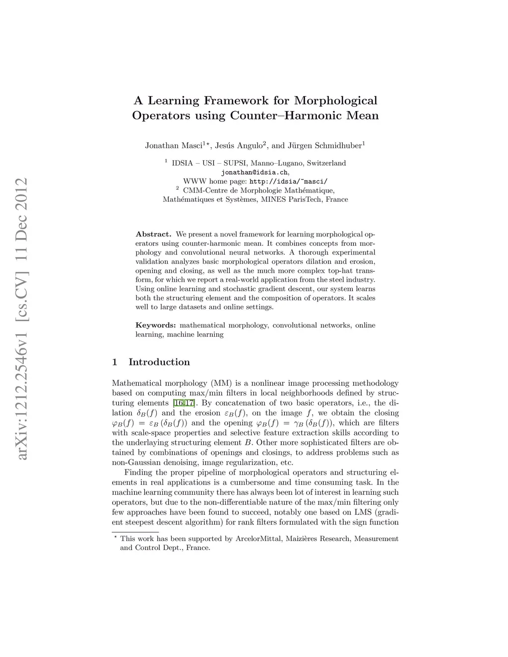 We present a novel framework for learning morphological operators using counter-harmonic mean. It combines concepts from morphology and convolutional neural networks. A thorough experimental validation analyzes basic morphological operators dilation and erosion, opening and closing, as well as the much more complex top-hat transform, for which we report a real-world application from the steel industry. Using online learning and stochastic gradient descent, our system learns both the structuring element and the composition of operators. It scales well to large datasets and online settings.