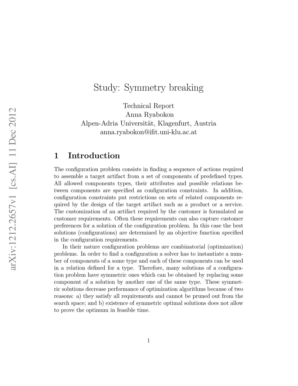 In their nature configuration problems are combinatorial (optimization) problems. In order to find a configuration a solver has to instantiate a number of components of a some type and each of these components can be used in a relation defined for a type. Therefore, many solutions of a configuration problem have symmetric ones which can be obtained by replacing some component of a solution by another one of the same type. These symmetric solutions decrease performance of optimization algorithms because of two reasons: a) they satisfy all requirements and cannot be pruned out from the search space; and b) existence of symmetric optimal solutions does not allow to prove the optimum in a feasible time.