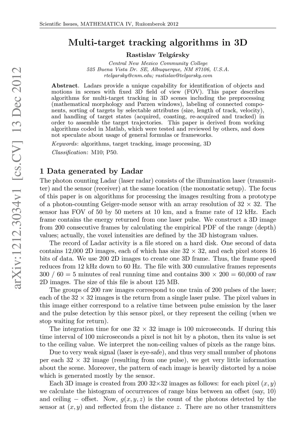 Ladars provide a unique capability for identification of objects and motions in scenes with fixed 3D field of view (FOV). This paper describes algorithms for multi-target tracking in 3D scenes including the preprocessing (mathematical morphology and Parzen windows), labeling of connected components, sorting of targets by selectable attributes (size, length of track, velocity), and handling of target states (acquired, coasting, re-acquired and tracked) in order to assemble the target trajectories. This paper is derived from working algorithms coded in Matlab, which were tested and reviewed by others, and does not speculate about usage of general formulas or frameworks.