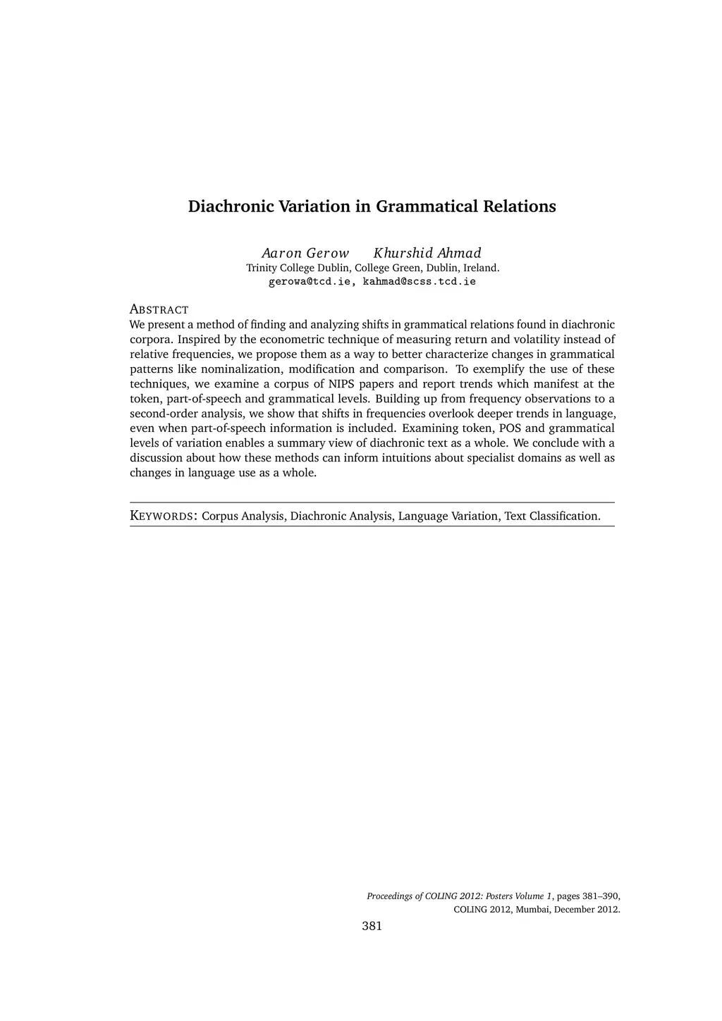 We present a method of finding and analyzing shifts in grammatical relations found in diachronic corpora. Inspired by the econometric technique of measuring return and volatility instead of relative frequencies, we propose them as a way to better characterize changes in grammatical patterns like nominalization, modification and comparison. To exemplify the use of these techniques, we examine a corpus of NIPS papers and report trends which manifest at the token, part-of-speech and grammatical levels. Building up from frequency observations to a second-order analysis, we show that shifts in frequencies overlook deeper trends in language, even when part-of-speech information is included. Examining token, POS and grammatical levels of variation enables a summary view of diachronic text as a whole. We conclude with a discussion about how these methods can inform intuitions about specialist domains as well as changes in language use as a whole.