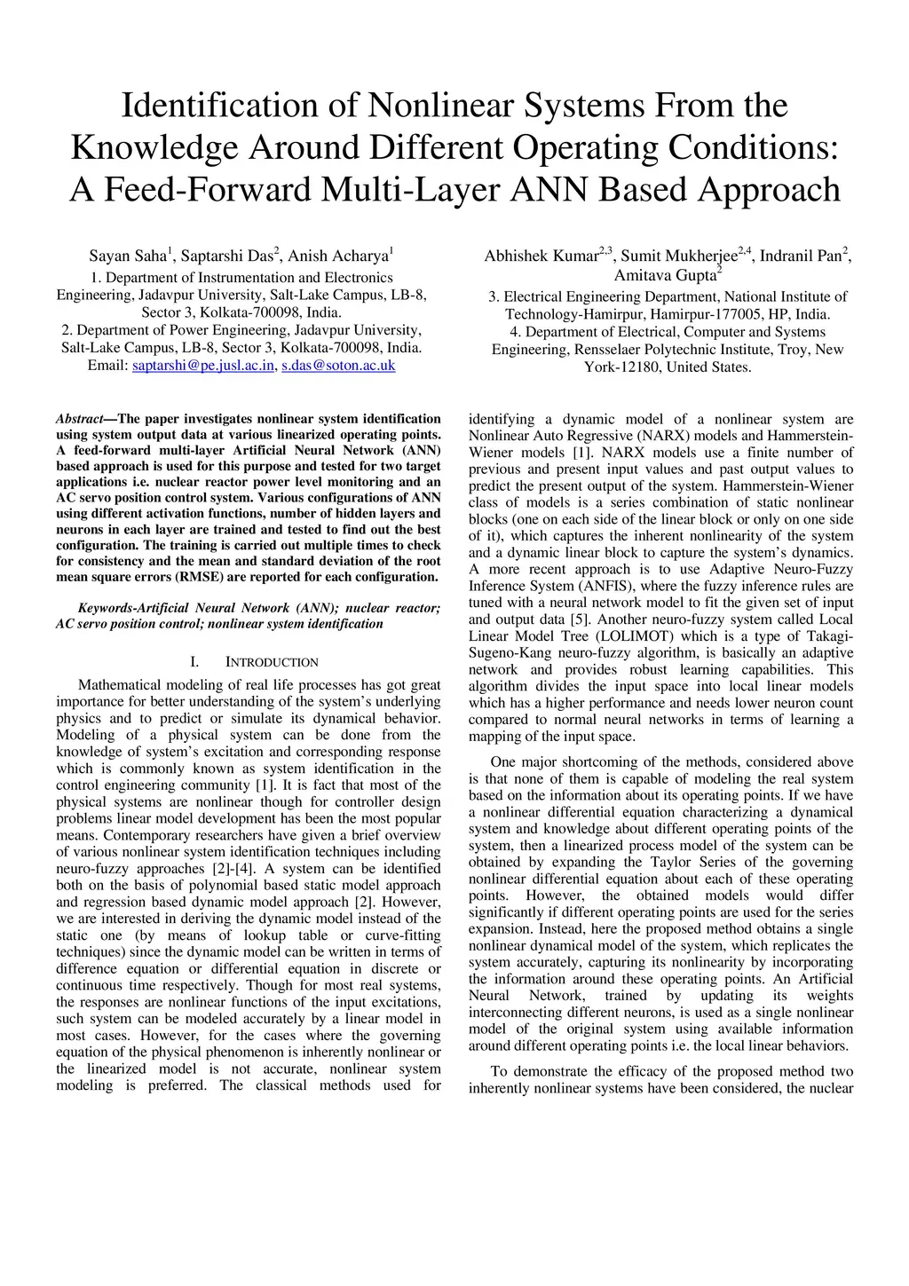 The paper investigates nonlinear system identification using system output data at various linearized operating points. A feed-forward multi-layer Artificial Neural Network (ANN) based approach is used for this purpose and tested for two target applications i.e. nuclear reactor power level monitoring and an AC servo position control system. Various configurations of ANN using different activation functions, number of hidden layers and neurons in each layer are trained and tested to find out the best configuration. The training is carried out multiple times to check for consistency and the mean and standard deviation of the root mean square errors (RMSE) are reported for each configuration.