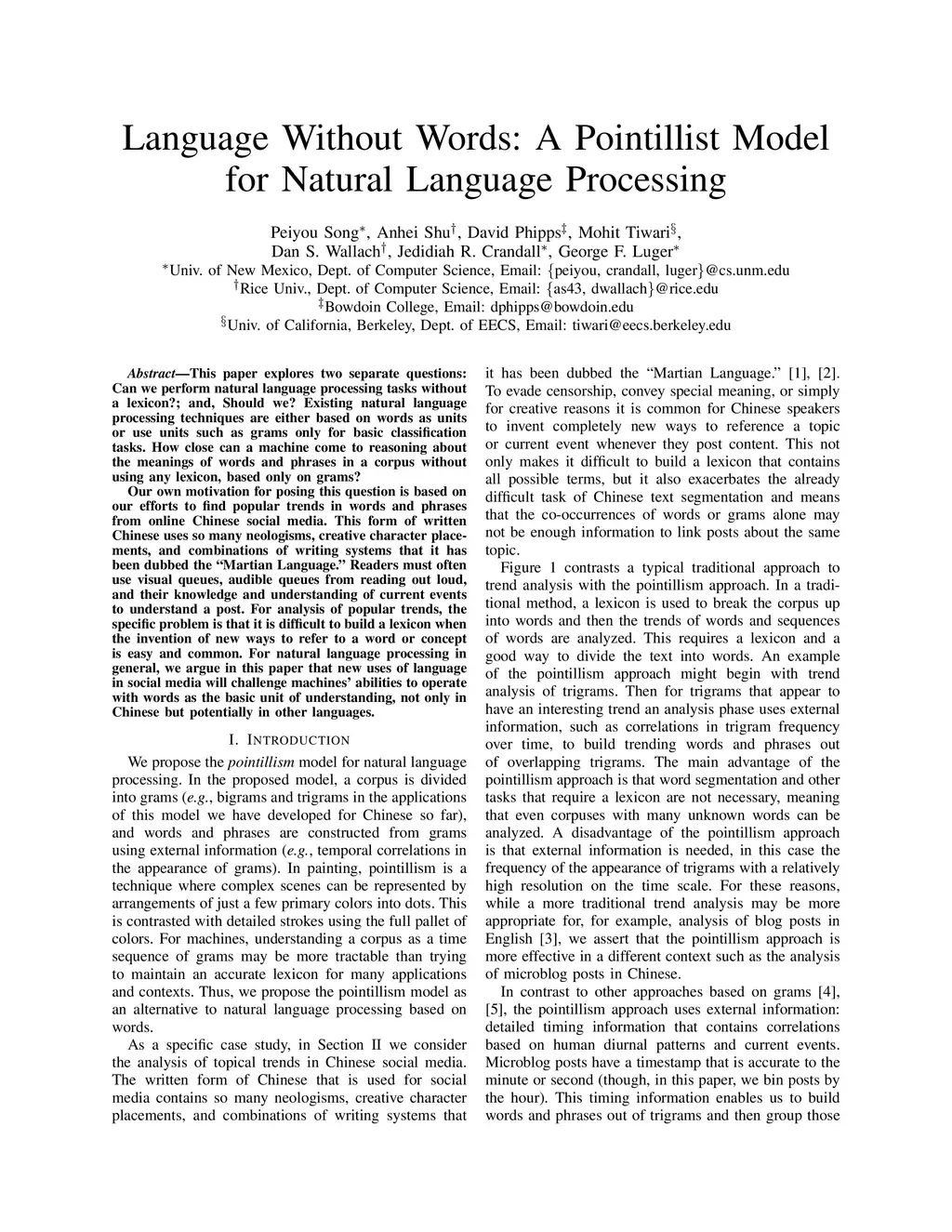 This paper explores two separate questions: Can we perform natural language processing tasks without a lexicon?; and, Should we? Existing natural language processing techniques are either based on words as units or use units such as grams only for basic classification tasks. How close can a machine come to reasoning about the meanings of words and phrases in a corpus without using any lexicon, based only on grams? Our own motivation for posing this question is based on our efforts to find popular trends in words and phrases from online Chinese social media. This form of written Chinese uses so many neologisms, creative character placements, and combinations of writing systems that it has been dubbed the "Martian Language." Readers must often use visual queues, audible queues from reading out loud, and their knowledge and understanding of current events to understand a post. For analysis of popular trends, the specific problem is that it is difficult to build a lexicon when the invention of new ways to refer to a word or concept is easy and common. For natural language processing in general, we argue in this paper that new uses of language in social media will challenge machines' abilities to operate with words as the basic unit of understanding, not only in Chinese but potentially in other languages.