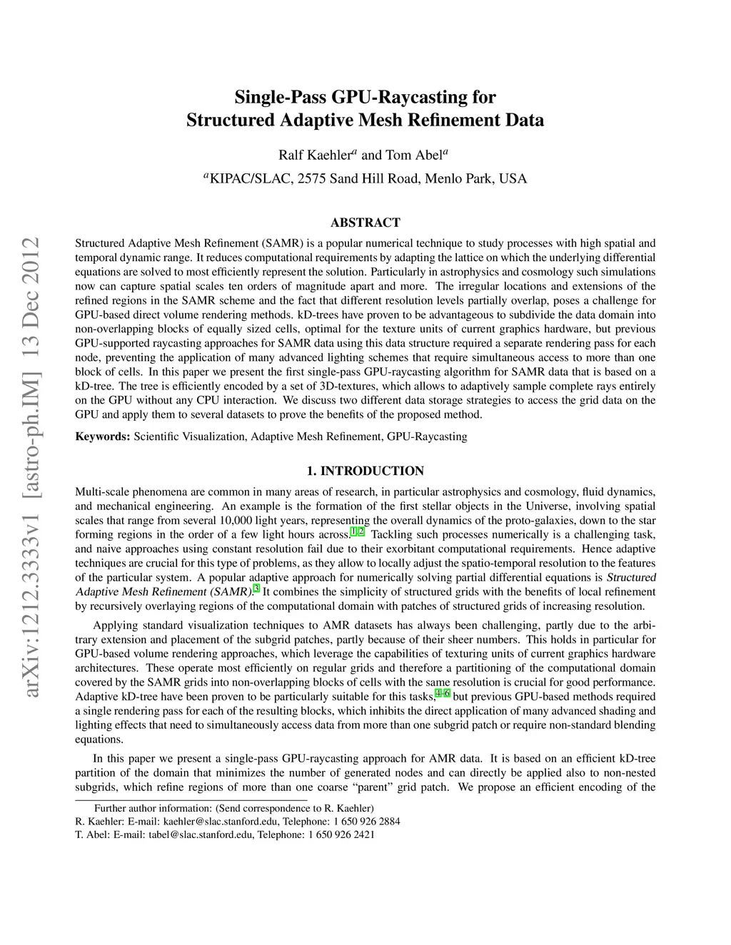 Structured Adaptive Mesh Refinement (SAMR) is a popular numerical technique to study processes with high spatial and temporal dynamic range. It reduces computational requirements by adapting the lattice on which the underlying differential equations are solved to most efficiently represent the solution. Particularly in astrophysics and cosmology such simulations now can capture spatial scales ten orders of magnitude apart and more. The irregular locations and extensions of the refined regions in the SAMR scheme and the fact that different resolution levels partially overlap, poses a challenge for GPU-based direct volume rendering methods. kD-trees have proven to be advantageous to subdivide the data domain into non-overlapping blocks of equally sized cells, optimal for the texture units of current graphics hardware, but previous GPU-supported raycasting approaches for SAMR data using this data structure required a separate rendering pass for each node, preventing the application of many advanced lighting schemes that require simultaneous access to more than one block of cells. In this paper we present a single-pass GPU-raycasting algorithm for SAMR data that is based on a kD-tree. The tree is efficiently encoded by a set of 3D-textures, which allows to adaptively sample complete rays entirely on the GPU without any CPU interaction. We discuss two different data storage strategies to access the grid data on the GPU and apply them to several datasets to prove the benefits of the proposed method.
