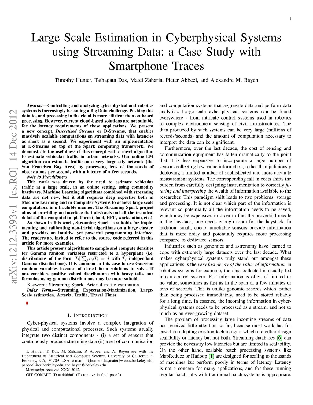 Controlling and analyzing cyberphysical and robotics systems is increasingly becoming a Big Data challenge. Pushing this data to, and processing in the cloud is more efficient than on-board processing. However, current cloud-based solutions are not suitable for the latency requirements of these applications. We present a new concept, Discretized Streams or D-Streams, that enables massively scalable computations on streaming data with latencies as short as a second. We experiment with an implementation of D-Streams on top of the Spark computing framework. We demonstrate the usefulness of this concept with a novel algorithm to estimate vehicular traffic in urban networks. Our online EM algorithm can estimate traffic on a very large city network (the San Francisco Bay Area) by processing tens of thousands of observations per second, with a latency of a few seconds.