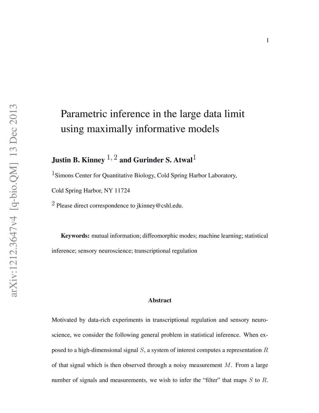 Motivated by data-rich experiments in transcriptional regulation and sensory neuroscience, we consider the following general problem in statistical inference. When exposed to a high-dimensional signal S, a system of interest computes a representation R of that signal which is then observed through a noisy measurement M. From a large number of signals and measurements, we wish to infer the "filter" that maps S to R. However, the standard method for solving such problems, likelihood-based inference, requires perfect a priori knowledge of the "noise function" mapping R to M. In practice such noise functions are usually known only approximately, if at all, and using an incorrect noise function will typically bias the inferred filter. Here we show that, in the large data limit, this need for a pre-characterized noise function can be circumvented by searching for filters that instead maximize the mutual information I[M;R] between observed measurements and predicted representations. Moreover, if the correct filter lies within the space of filters being explored, maximizing mutual information becomes equivalent to simultaneously maximizing every dependence measure that satisfies the Data Processing Inequality. It is important to note that maximizing mutual information will typically leave a small number of directions in parameter space unconstrained. We term these directions "diffeomorphic modes" and present an equation that allows these modes to be derived systematically. The presence of diffeomorphic modes reflects a fundamental and nontrivial substructure within parameter space, one that is obscured by standard likelihood-based inference.
