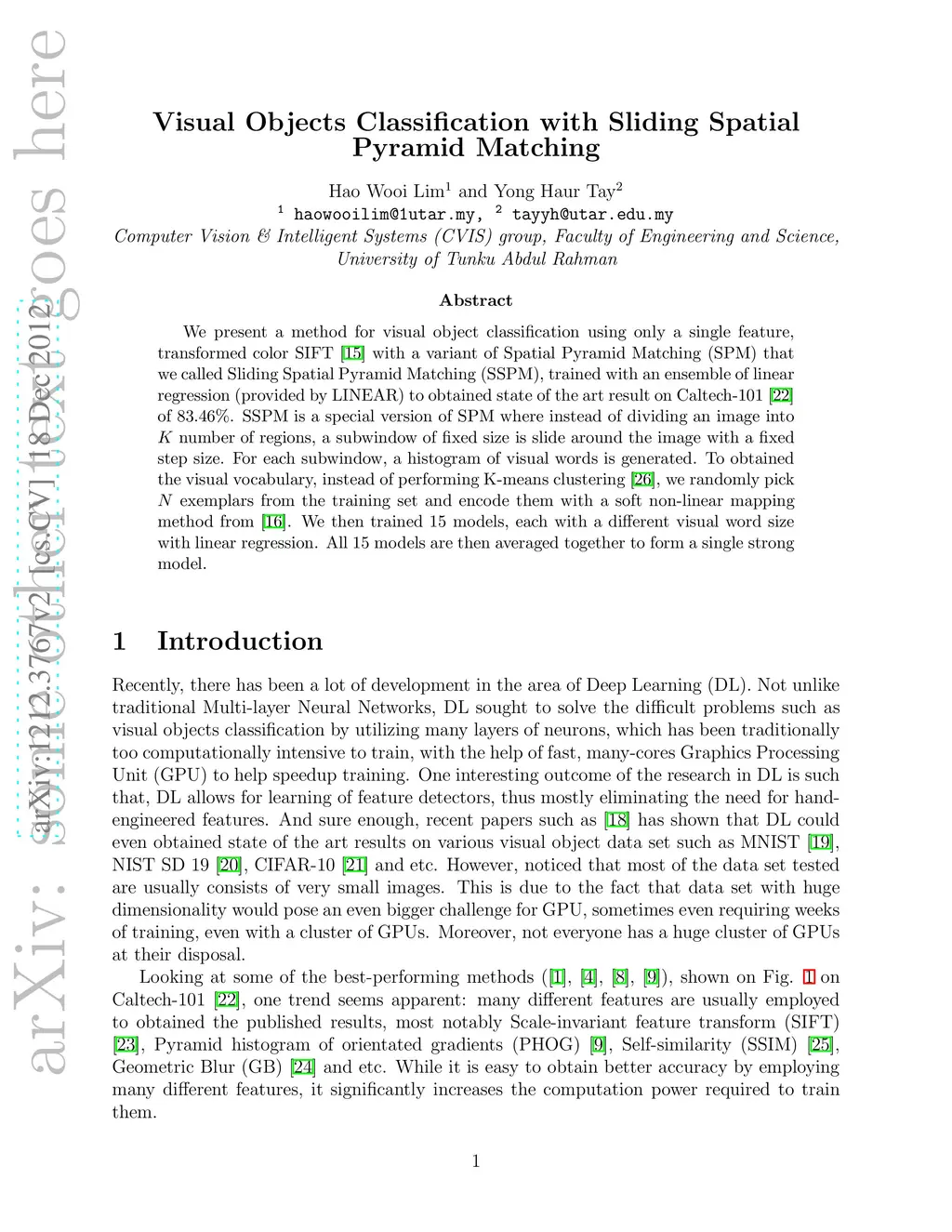 We present a method for visual object classification using only a single feature, transformed color SIFT with a variant of Spatial Pyramid Matching (SPM) that we called Sliding Spatial Pyramid Matching (SSPM), trained with an ensemble of linear regression (provided by LINEAR) to obtained state of the art result on Caltech-101 of 83.46%. SSPM is a special version of SPM where instead of dividing an image into K number of regions, a subwindow of fixed size is slide around the image with a fixed step size. For each subwindow, a histogram of visual words is generated. To obtained the visual vocabulary, instead of performing K-means clustering, we randomly pick N exemplars from the training set and encode them with a soft non-linear mapping method. We then trained 15 models, each with a different visual word size with linear regression. All 15 models are then averaged together to form a single strong model.