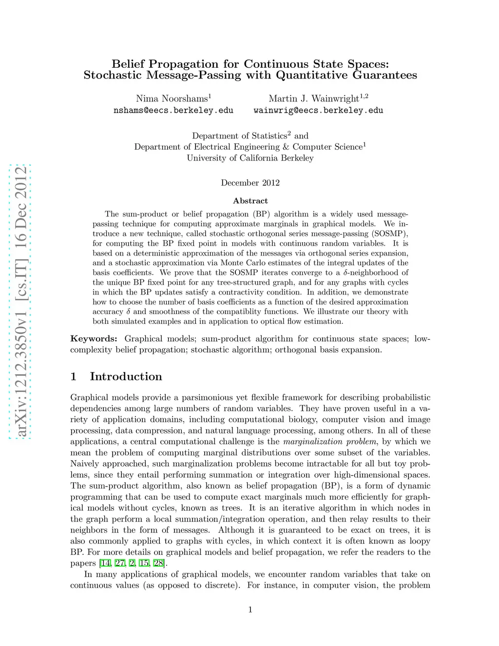 The sum-product or belief propagation (BP) algorithm is a widely used message-passing technique for computing approximate marginals in graphical models. We introduce a new technique, called stochastic orthogonal series message-passing (SOSMP), for computing the BP fixed point in models with continuous random variables. It is based on a deterministic approximation of the messages via orthogonal series expansion, and a stochastic approximation via Monte Carlo estimates of the integral updates of the basis coefficients. We prove that the SOSMP iterates converge to a \delta-neighborhood of the unique BP fixed point for any tree-structured graph, and for any graphs with cycles in which the BP updates satisfy a contractivity condition. In addition, we demonstrate how to choose the number of basis coefficients as a function of the desired approximation accuracy \delta and smoothness of the compatibility functions. We illustrate our theory with both simulated examples and in application to optical flow estimation.