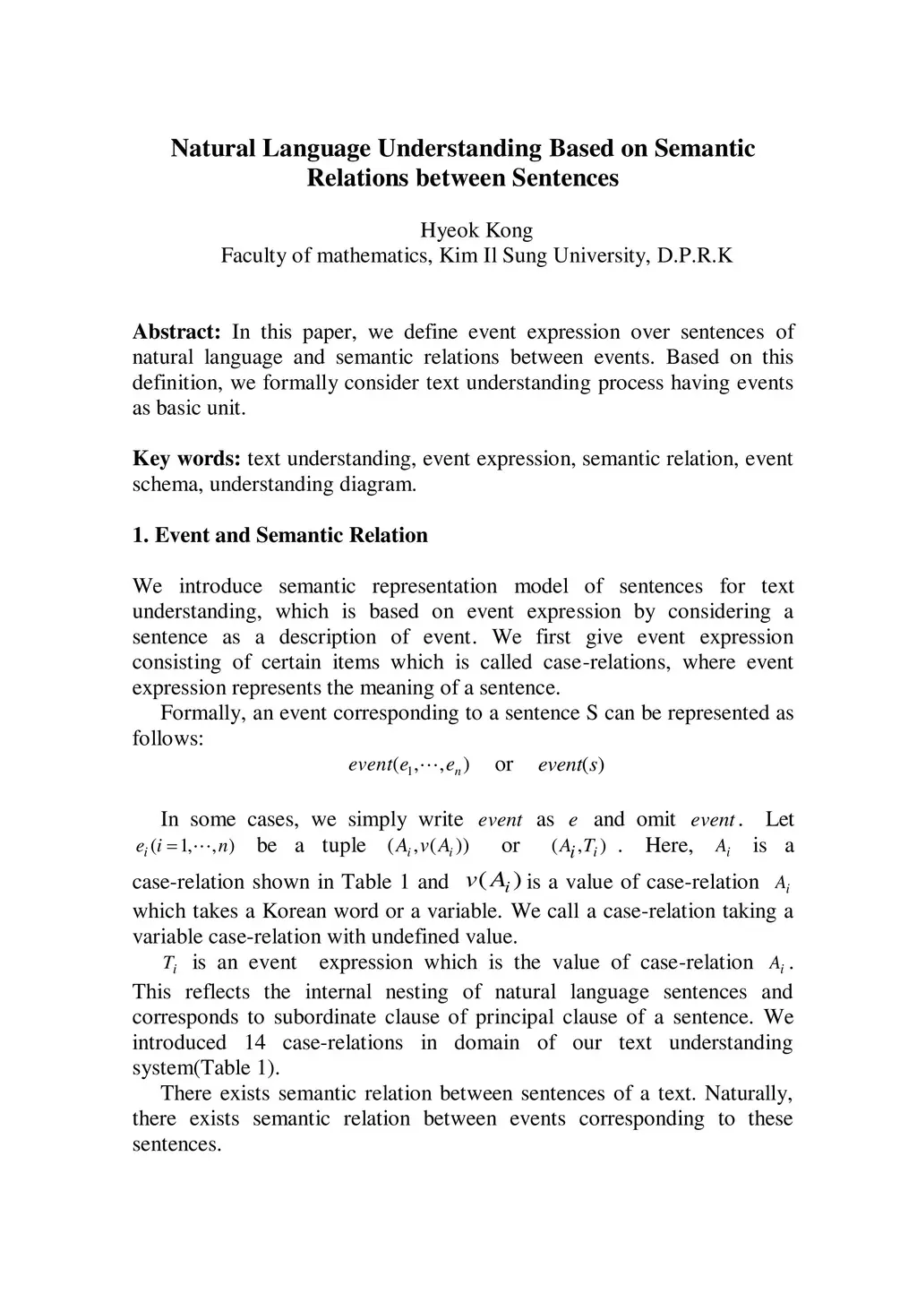 In this paper, we define event expression over sentences of natural language and semantic relations between events. Based on this definition, we formally consider text understanding process having events as basic unit.