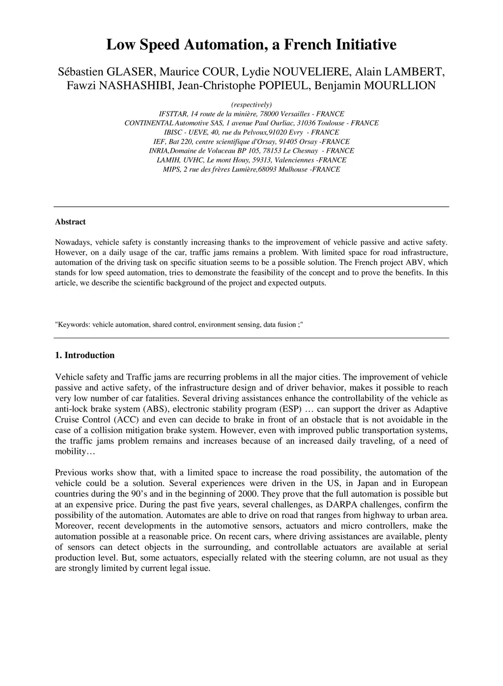 Nowadays, vehicle safety is constantly increasing thanks to the improvement of vehicle passive and active safety. However, on a daily usage of the car, traffic jams remains a problem. With limited space for road infrastructure, automation of the driving task on specific situation seems to be a possible solution. The French project ABV, which stands for low speed automation, tries to demonstrate the feasibility of the concept and to prove the benefits. In this article, we describe the scientific background of the project and expected outputs.