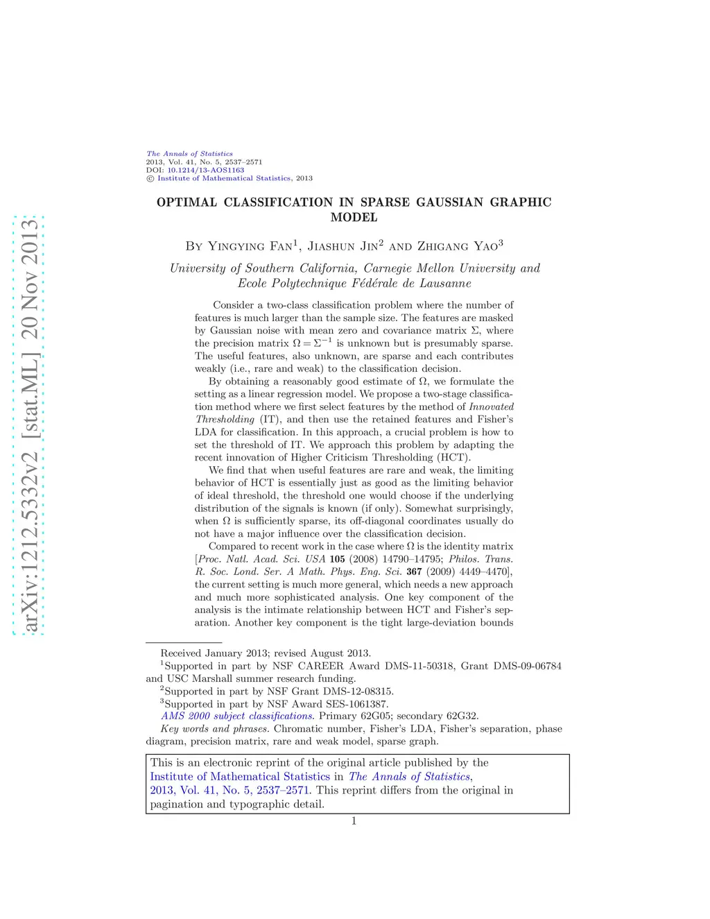Consider a two-class classification problem where the number of features is much larger than the sample size. The features are masked by Gaussian noise with mean zero and covariance matrix , where the precision matrix is unknown but is presumably sparse. The useful features, also unknown, are sparse and each contributes weakly (i.e., rare and weak) to the classification decision. By obtaining a reasonably good estimate of , we formulate the setting as a linear regression model. We propose a two-stage classification method where we first select features by the method of Innovated Thresholding (IT), and then use the retained features and Fisher's LDA for classification. In this approach, a crucial problem is how to set the threshold of IT. We approach this problem by adapting the recent innovation of Higher Criticism Thresholding (HCT). We find that when useful features are rare and weak, the limiting behavior of HCT is essentially just as good as the limiting behavior of ideal threshold, the threshold one would choose if the underlying distribution of the signals is known (if only). Somewhat surprisingly, when is sufficiently sparse, its off-diagonal coordinates usually do not have a major influence over the classification decision. Compared to recent work in the case where is the identity matrix [Proc. Natl. Acad. Sci. USA 105 (2008) 14790-14795; Philos. Trans. R. Soc. Lond. Ser. A Math. Phys. Eng. Sci. 367 (2009) 4449-4470], the current setting is much more general, which needs a new approach and much more sophisticated analysis. One key component of the analysis is the intimate relationship between HCT and Fisher's separation. Another key component is the tight large-deviation bounds for empirical processes for data with unconventional correlation structures, where graph theory on vertex coloring plays an important role.